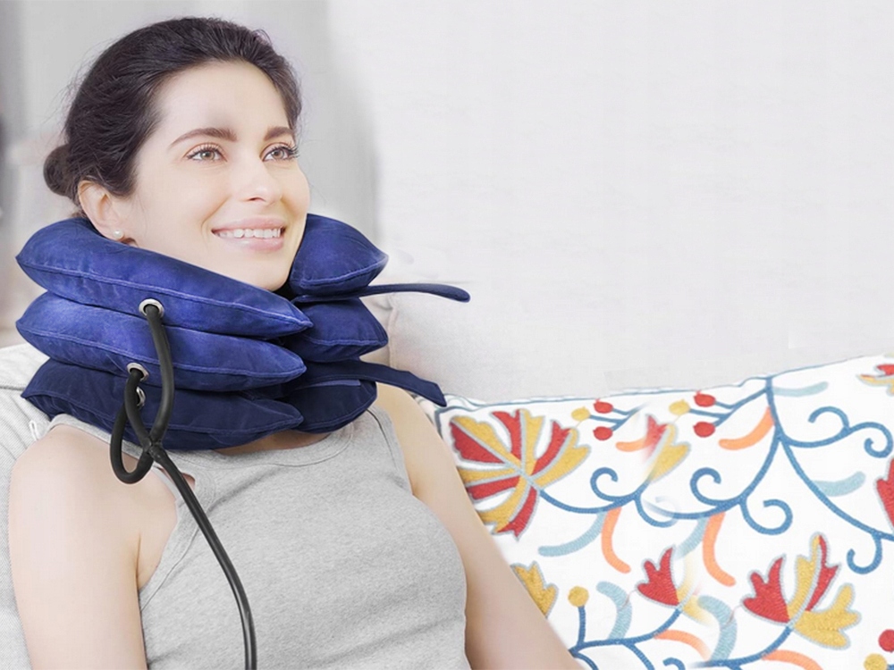 Трёхуровневая надувная подушка для вытяжения шеи — специализированное устройство, предназначенное для растягивания и снятия болей в шее и шейном отделе позвоночника. Имеет три уровня регулировки, что позволяет позволяет регулировать интенсивность тяги под индивидуальные предпочтения и потребности пользователя.