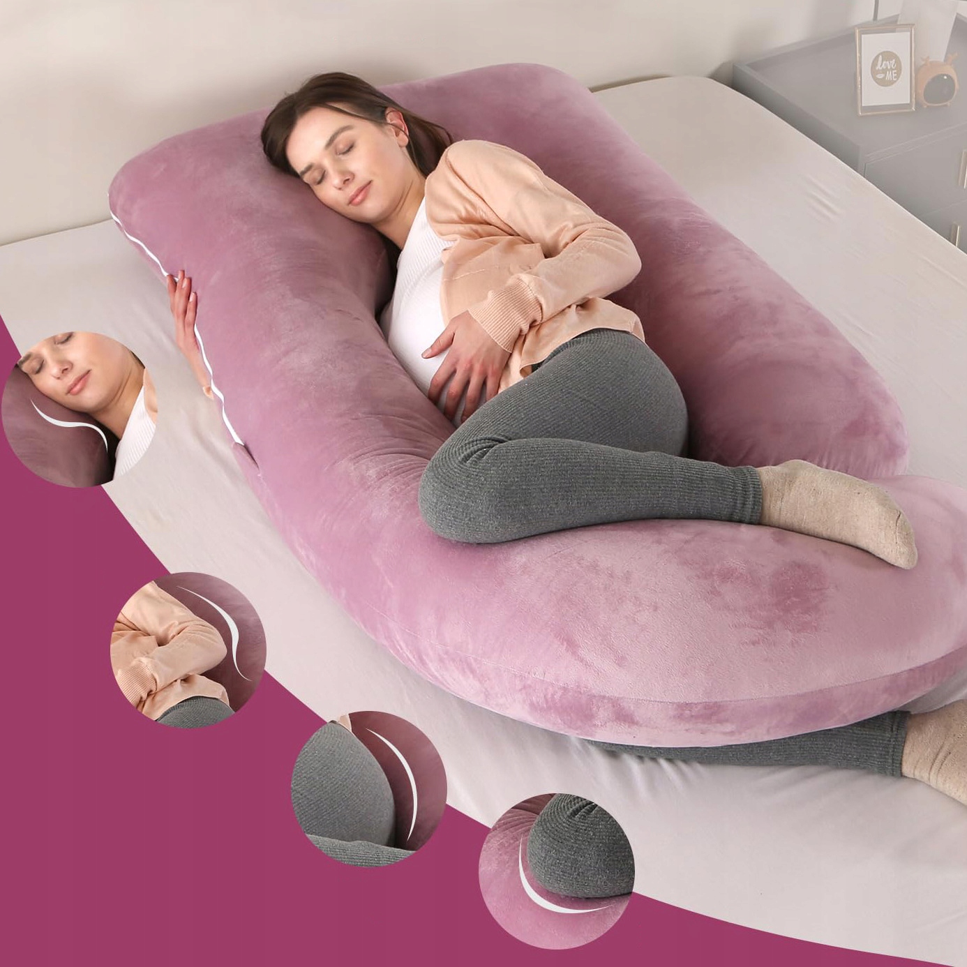 Эта J-образная подушка для беременных отлично подходит для беременных женщин и людей, перенесших операцию, и используется в качестве поддерживающей подушки. Помогает при болях в поясничном отделе позвоночника, поддерживает положение сна на боку, помогает при физиотерапии, фибромиалгии. Также эффективен в борьбе с изжогой, кислотным рефлюксом, дискомфортом или тревогой во время беременности.