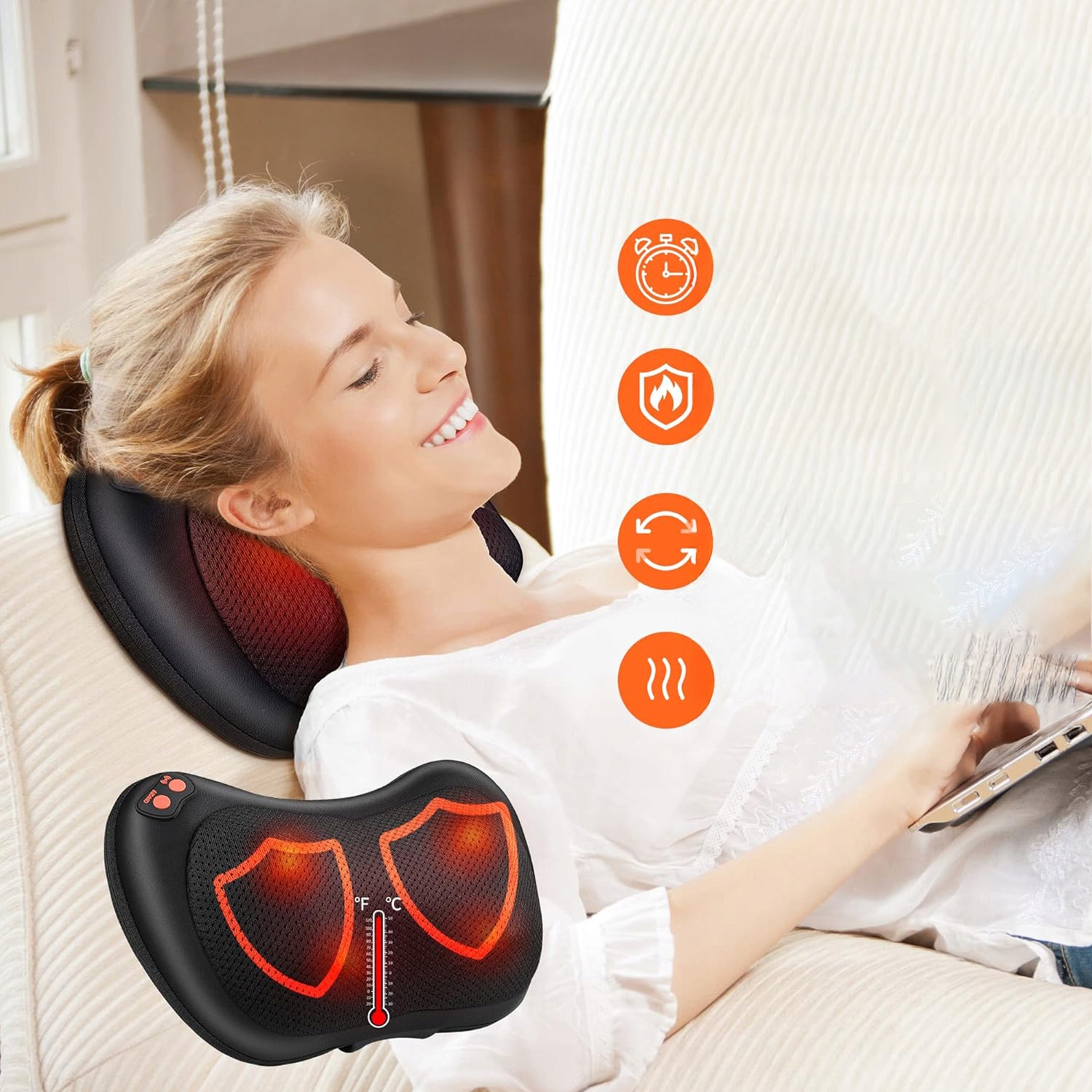 Компрессы с постоянной температурой 35°C поддерживают массаж, согревая и расслабляя напряженные и болезненные мышцы, обеспечивая при этом удовольствие от массажа и тепла. Встроенная защита от перегрева обеспечивает безопасную работу двигателя, исключая потенциальную угрозу безопасности. Это гарантирует комфортный и безопасный массаж.