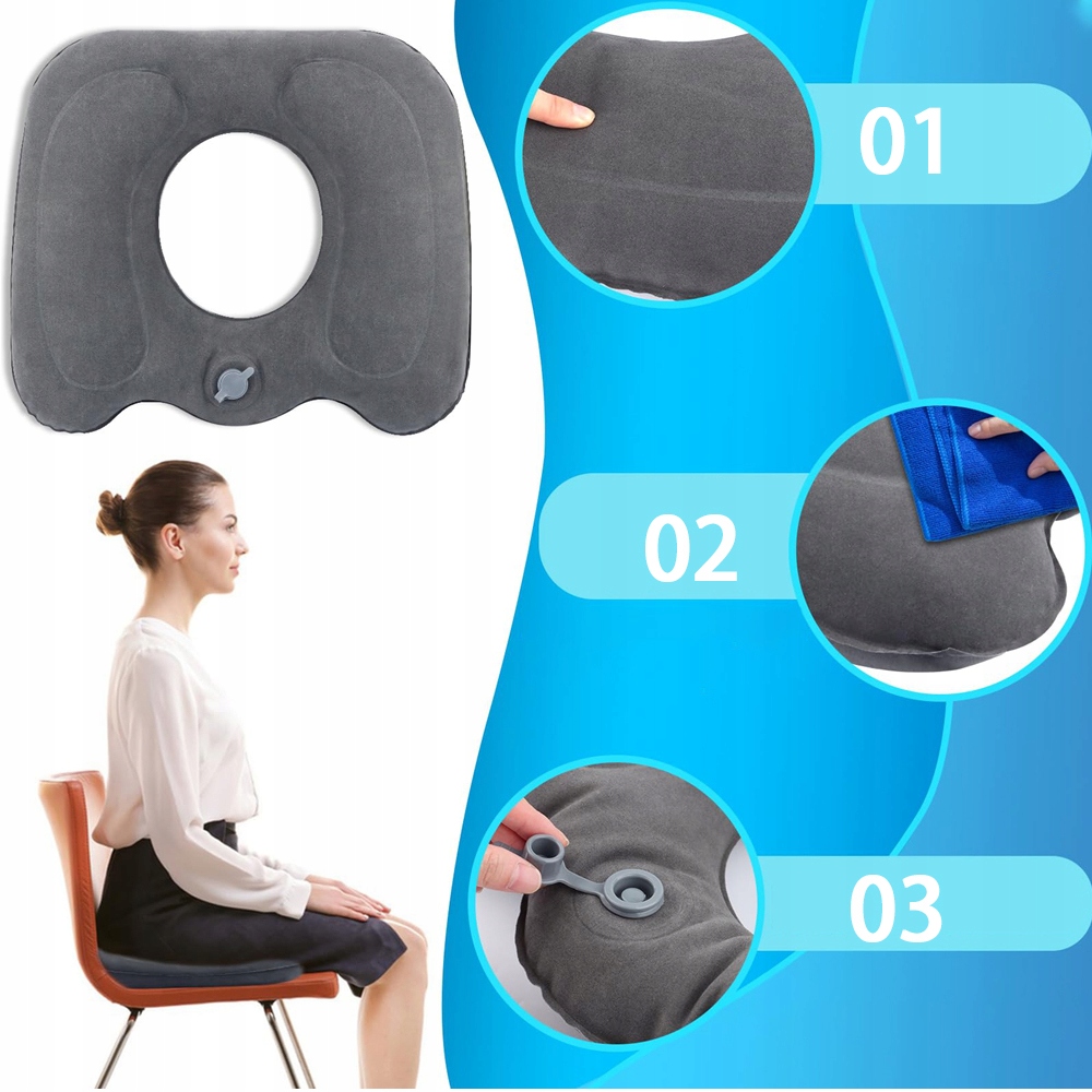 - - Подушка имеет эргономичную форму пончика, которая снимает давление на копчик и область таза, уменьшая дискомфорт и боль, вызванные длительным сидением.