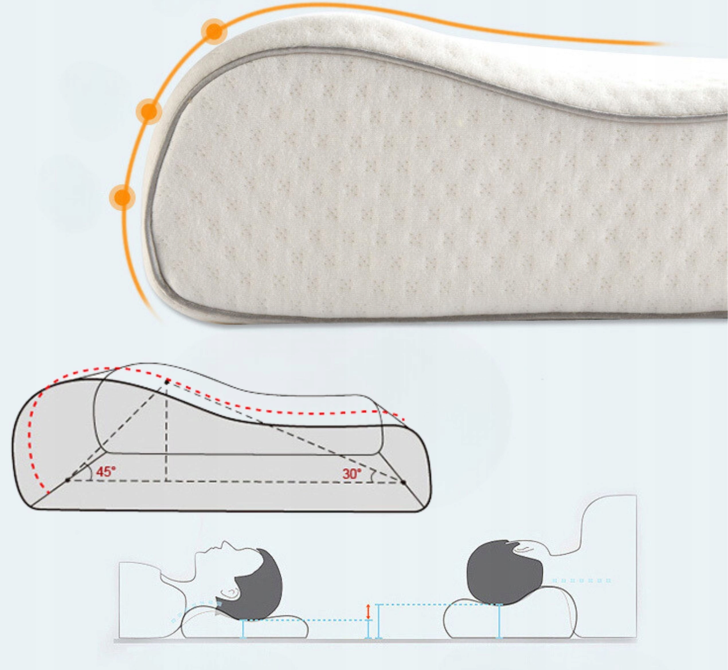 Ортопедическая подушка имеет профиль под соответствующим углом, что позволяет ей рассеивать давление на голову и шею. Специальное профилирование также снимает усталость и улучшает качество сна. В зависимости от наших предпочтений и телосложения мы можем спать на подушке как на нижней, так и на верхней стороне.