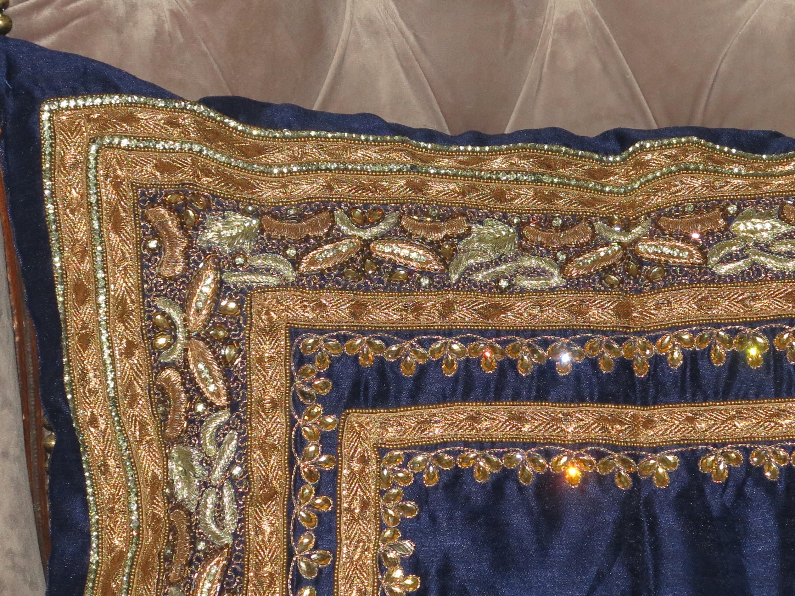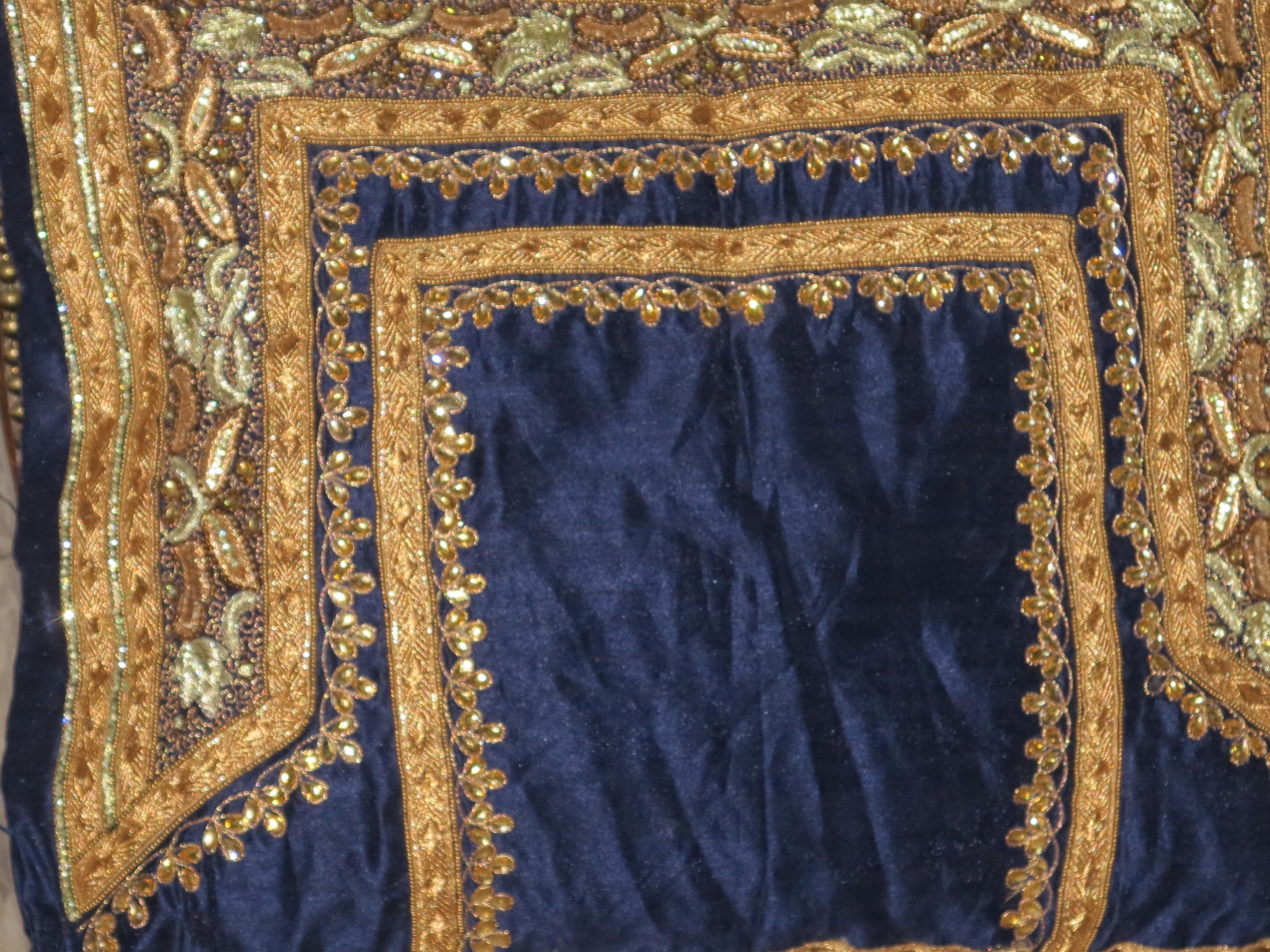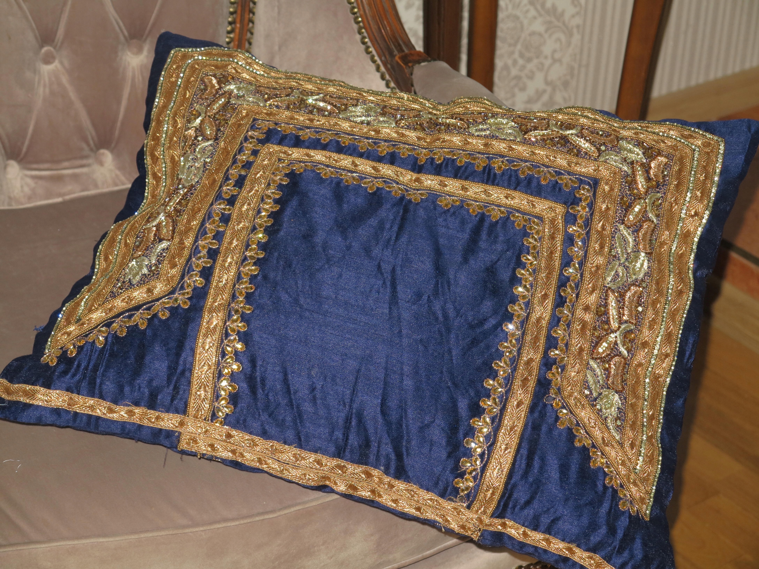 КРАСИВУЮ БОЛЬШУЮ ДВОРЕЦУПОДУШКУ, УКРАШЕННУЮ РУЧНОЙ ВЫШИВКОЙ С БОЛЬШИМИ ПАЙЕТКАМИ И БИСЕРОМ. ЦВЕТ КОБАЛЬТ ТЕМНО-СИНИЙ И ЗОЛОТОЙ