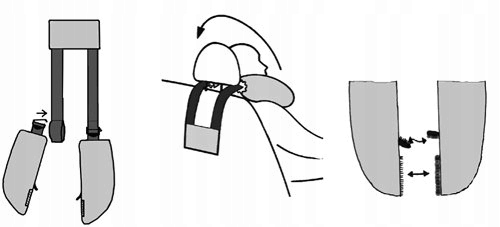 1. С противовесом (версия SleepFix® Baby) – установленную таким образом подушку также можно использовать в колясках или велосипедных прицепах. Прикрепляем входящий в комплект противовес к задней части подголовника, автокресла или коляски, прикрепляем к нему подушки, а затем перемещаем его так, чтобы подушка подошла к ребенку. Скрепляем подушки между собой под подбородком ребенка с помощью липучки.