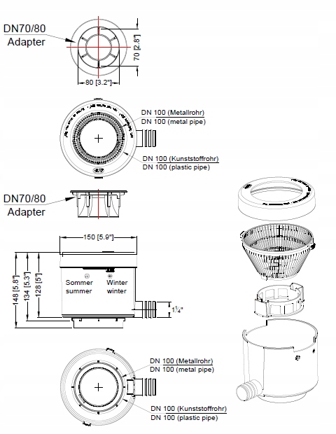 ✔ Диаметр желоба dn: 70, 80, 100 и 110 мм,