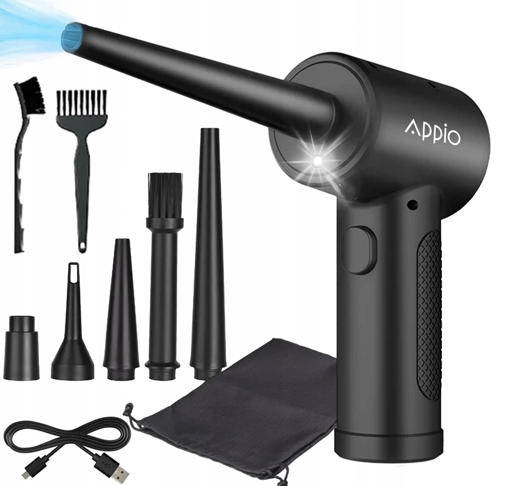 ✔️ Оригинальный беспроводной воздуходув ✔️ Сумка с аксессуарами ✔️ 5 воздушных насадок ✔️ 3 дополнительные щетки ✔️ Кабель для зарядки USB-C ✔️ Руководство пользователя на польском языке ✔️ Оригинальная коробка