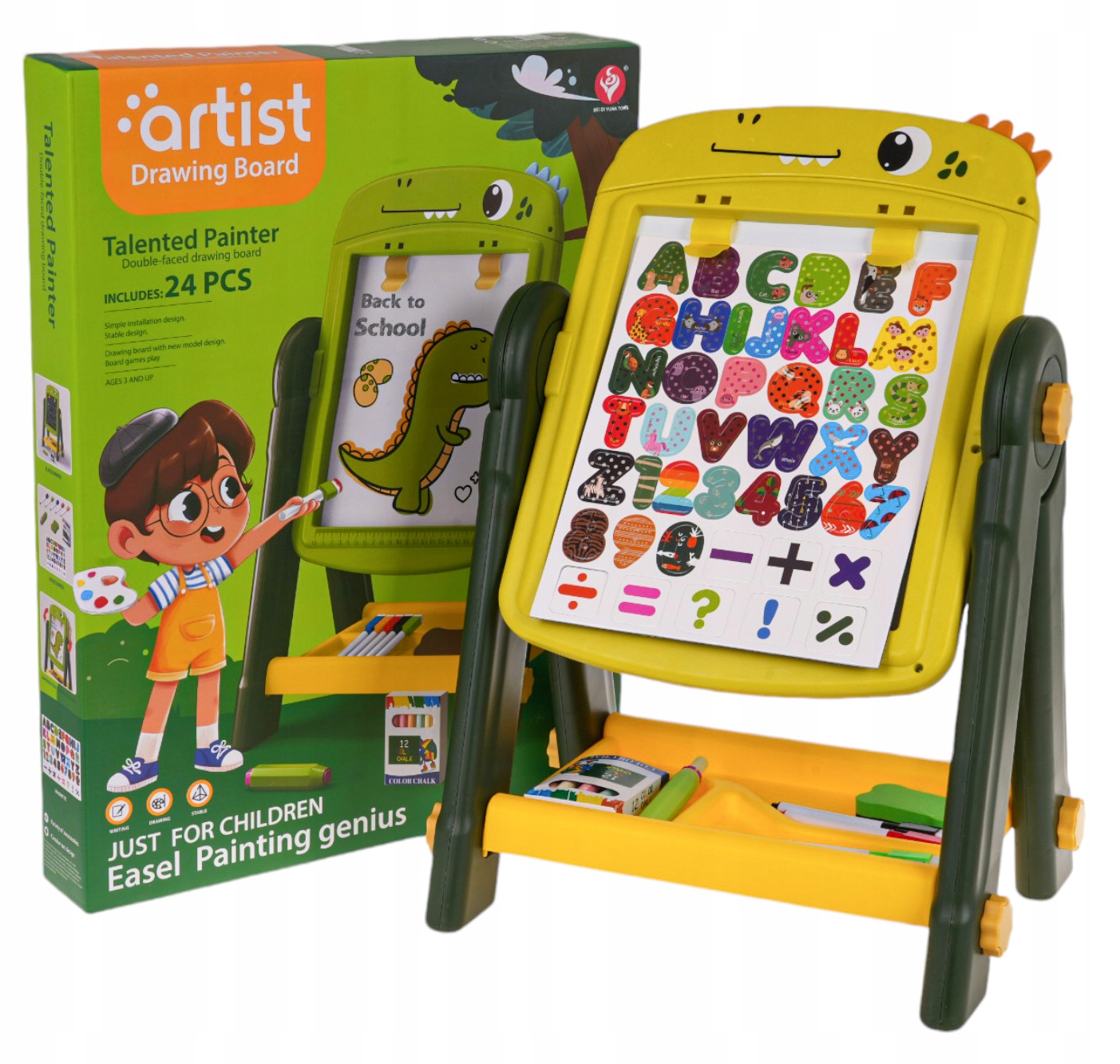 Двусторонняя плата на подставке с аксессуарами для детей от 3 лет. Дизайн стойки стабилен и прост в установке. Доски с обеих сторон магнитные, вы можете прикрепить к ним магниты. На черной стороне он рисует мелом и на белых ручках -tip -tip. Набор включает в себя мелки, мела, маркер и магнитов с буквами, числами и математическими действиями. Практическая полка для аксессуаров, доступных в наборе, был размещен под доской. На белой стороне прикреплены два зажима, к которым мы можем прикрепить лист бумаги. Набор разрабатывает ручные навыки, управляет рукой.
