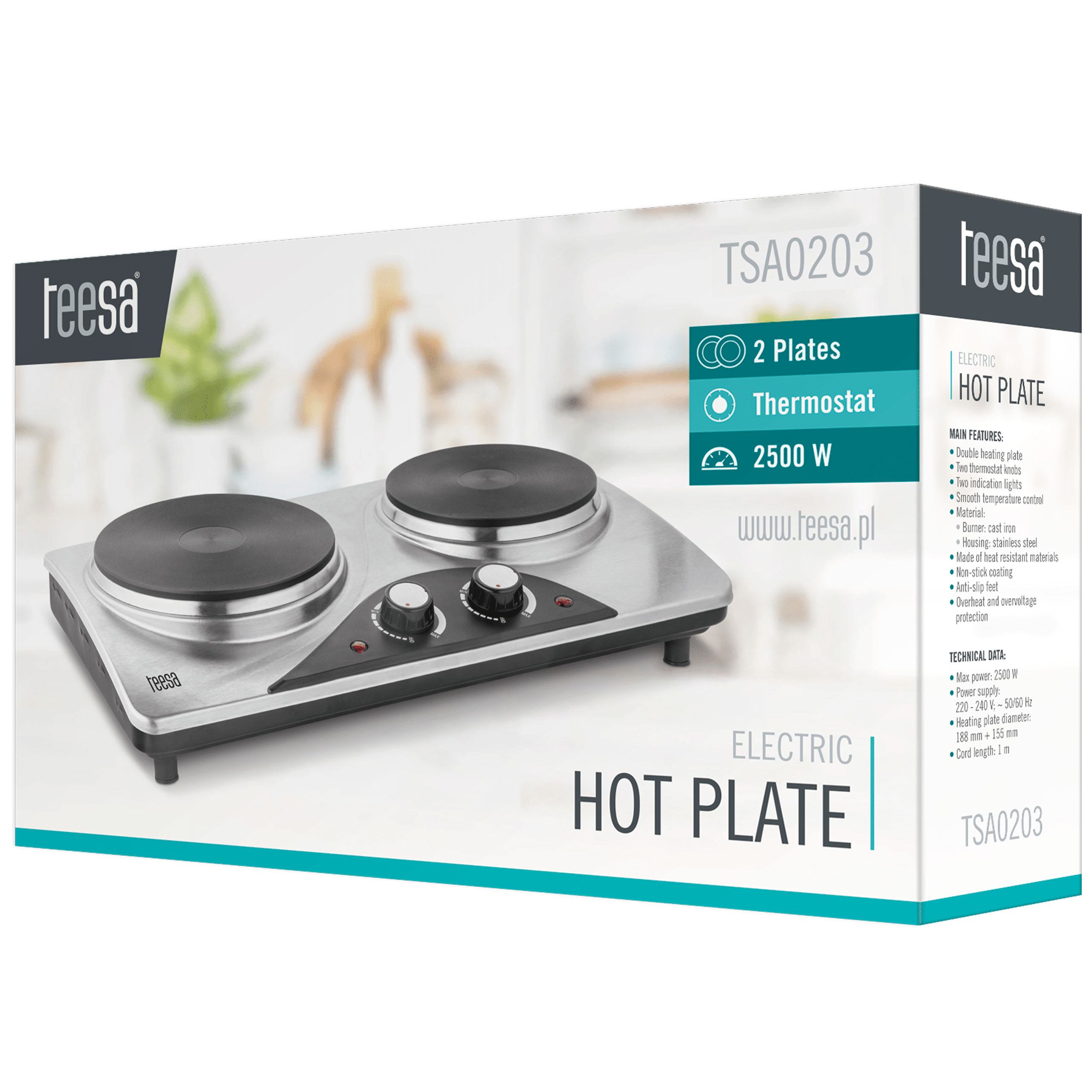 Проводите ли вы долгие семейные каникулы в лагере? Или, может быть, вам нужно устройство для вашего дома на участке, которое позволит вам без проблем приготовить еду для вашей семьи и друзей? В каждой из этих ситуаций удобная и компактная портативная электрическая плита Teesa TSA0203 с вместимостью 2500 Вт. Две чугунные нагревающие пластины в сочетании с ручками, дающими возможность регулировать температуру до 650 ° C, что приготовление ужина больше не является проблемой. теплые материалы. Модель TSA0203 изготовлена из нержавеющей стали с нежичным покрытием, которое определенно облегчает очистку. Стабильная и безопасная операция гарантируется не -слабыми ногами и функцией защиты от перегрева и перенапряжения. Кроме того, чтобы обеспечить максимальную безопасность, которая в настоящее время используется горелка, вы сообщите вам о управляемой лампе, установленной на каждом из них.