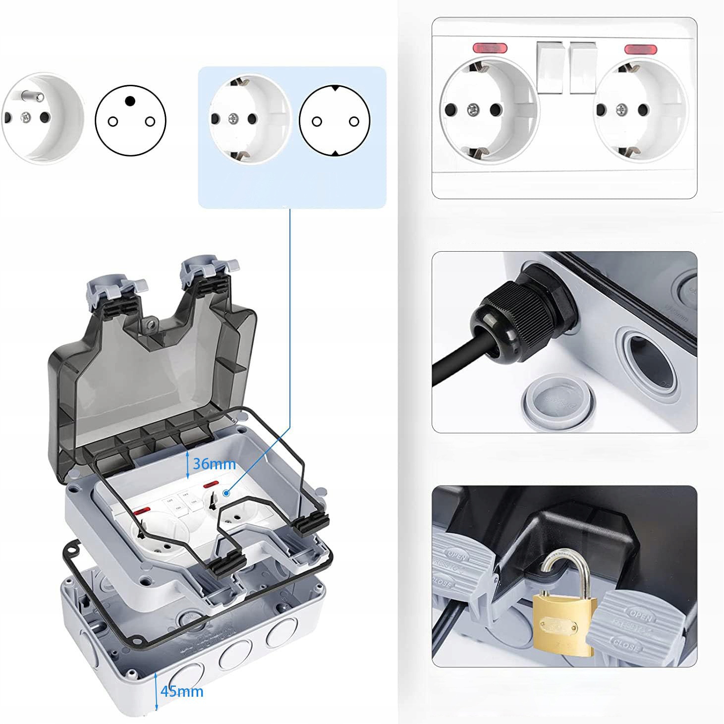 Большое пространство кабеля обеспечивает достаточно места для любой прямой или согнутой пробки и всех необходимых кабелей. В качестве монтированного настенного гнезда, пылепроницаемый и водонепроницаемый контактный гнездо подходит для внешних или внутренних влажных комнат, таких как кухни, ванные комнаты, туалеты, прачечные, балконы, террасы, роботы для косилок, насосы для водяных прудов, фонтаны, бассейны по бассейнам, сады с приподнятыми скидками, внешним освещением, паркингом, чешуйками, чешуйками, чешуйками, чешуйками, чешуйками, чешуйками, электрическими автомобилями, скидами.