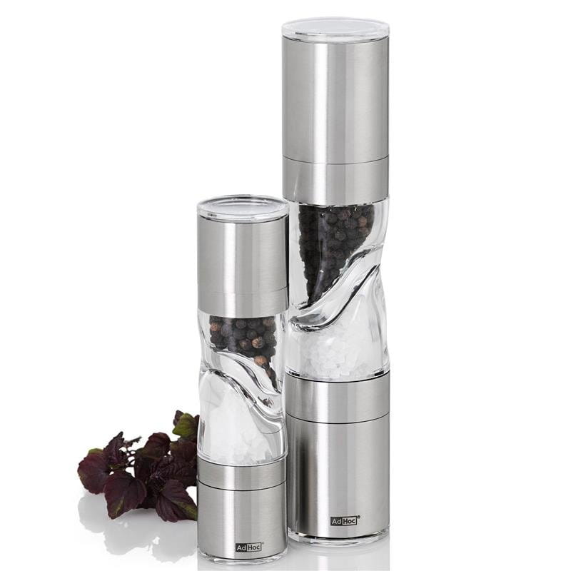 Двойная мини -шлифовальная шлифовка Duomill Pure Mini, разработанная Габриэле Калтенбахом, позволяет измельчить перцем с одной стороны и соль на другой. Рэк Ceracut®, используемые на устройстве, не только эффективно, коррозии и износостойкие, но и не поглощают запахи. Шагковая шлифовальная машина имеет механизм регулировки толщины измельчения в полном масштабе от малого до толстого размера. Прозрачные крышки с обеих сторон будут не только собирать крошки, но и ограничивать выветривание специй. Чтобы заполнить шлифовальную машину, вы должны взять одну руку для металлического кольца с акриловым резервуаром, а другой для бака и осторожно открутить контейнер, а затем залить в специи.