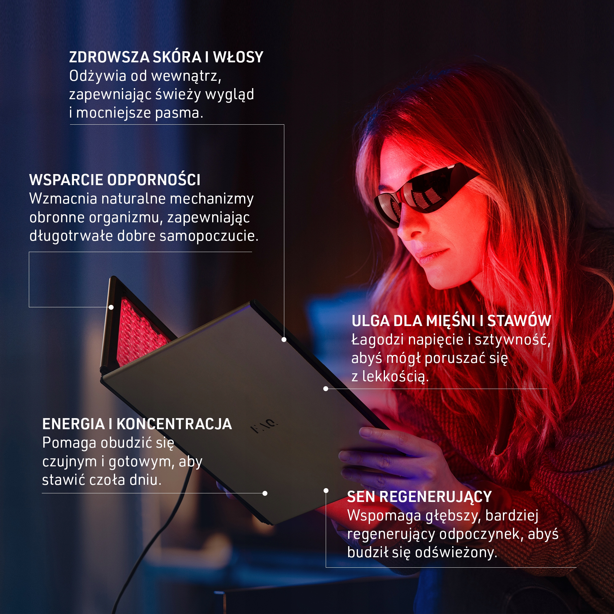 Красный и инфракрасный свет поддерживает улучшение текстуры кожи, придает более молодой вид и поддерживает более полные и здоровые волосы.
