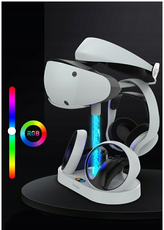 IPEGA PG-P5V001PS Docting Station является идеальным решением для каждого владельца PlayStation VR2, который ценит заказ и удобство в своем игровом углу. Благодаря этому вы зарядите свои контроллеры, храните виртуальные очки и наушники в одном месте, а стильная подсветка RGB придаст вашему пространству современный вид.