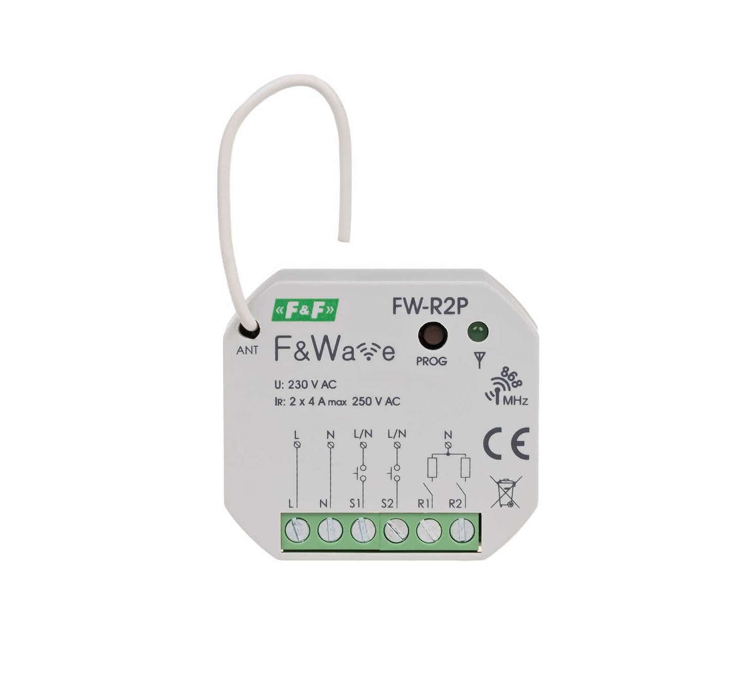 - Два независимых выходных контакта NO с грузоподъемностью 4 A (AC -1) каждый (внутренне подключен к L)