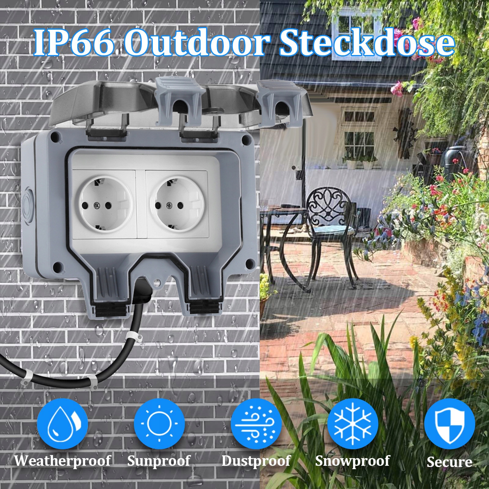 🔧 【Водонепроницаемое внешнее гнездо IP66】 закрытая конструкция с крышкой, степень защиты IP66, которая полностью водонепроницаемой и пылепроницаемый, обеспечивает безопасную подачу внешних зон и влажный. Дизайн глубины 5 см обеспечивает достаточно Места для пробок различных форм, чтобы легко закрыть крышку.