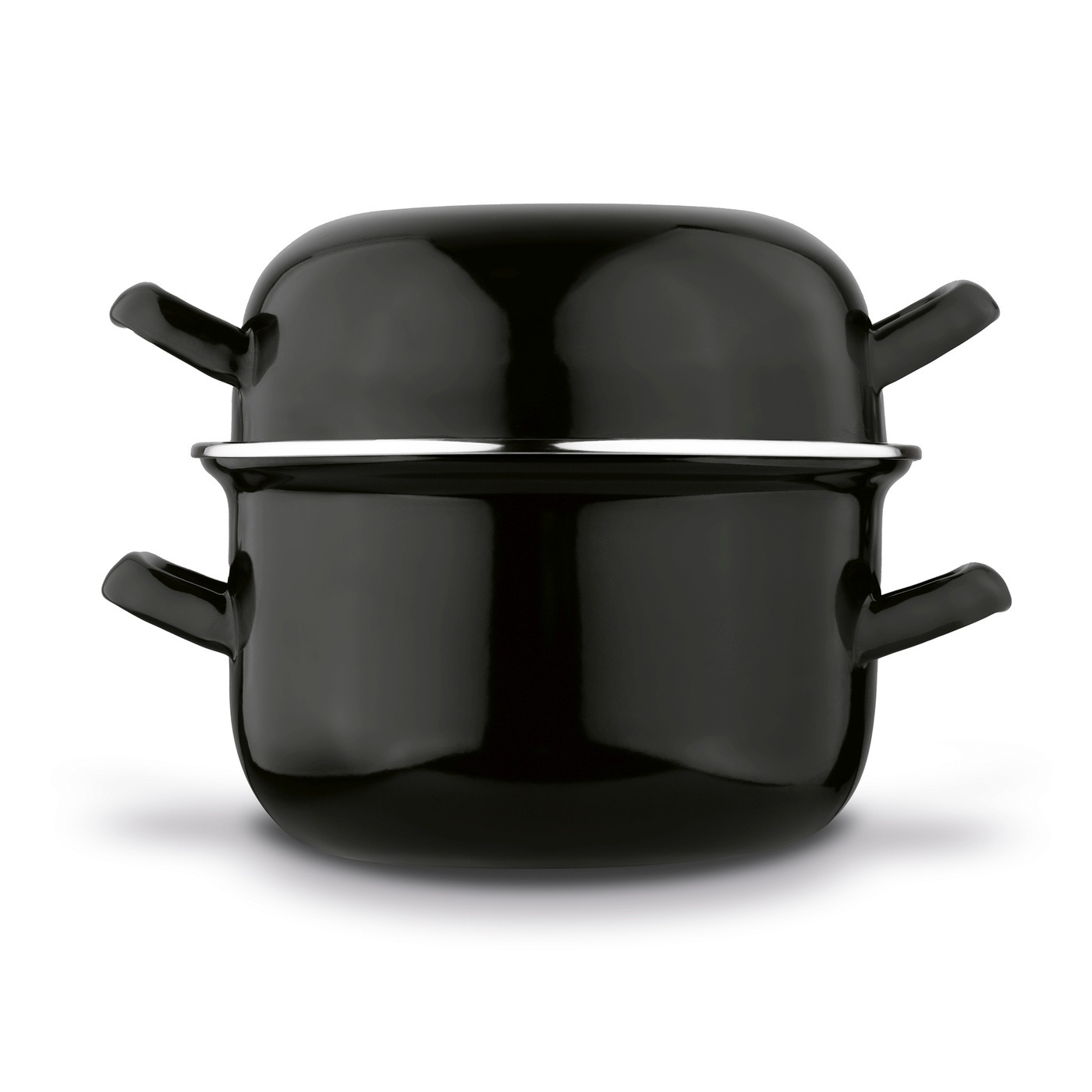 Эмалированное покрытие заботится о естественных ценностях пищи. Горшок имеет облегающую крышку, которая может быть использована в качестве второго, меньшего горшка. Это также хорошо работает при обслуживании мидий.