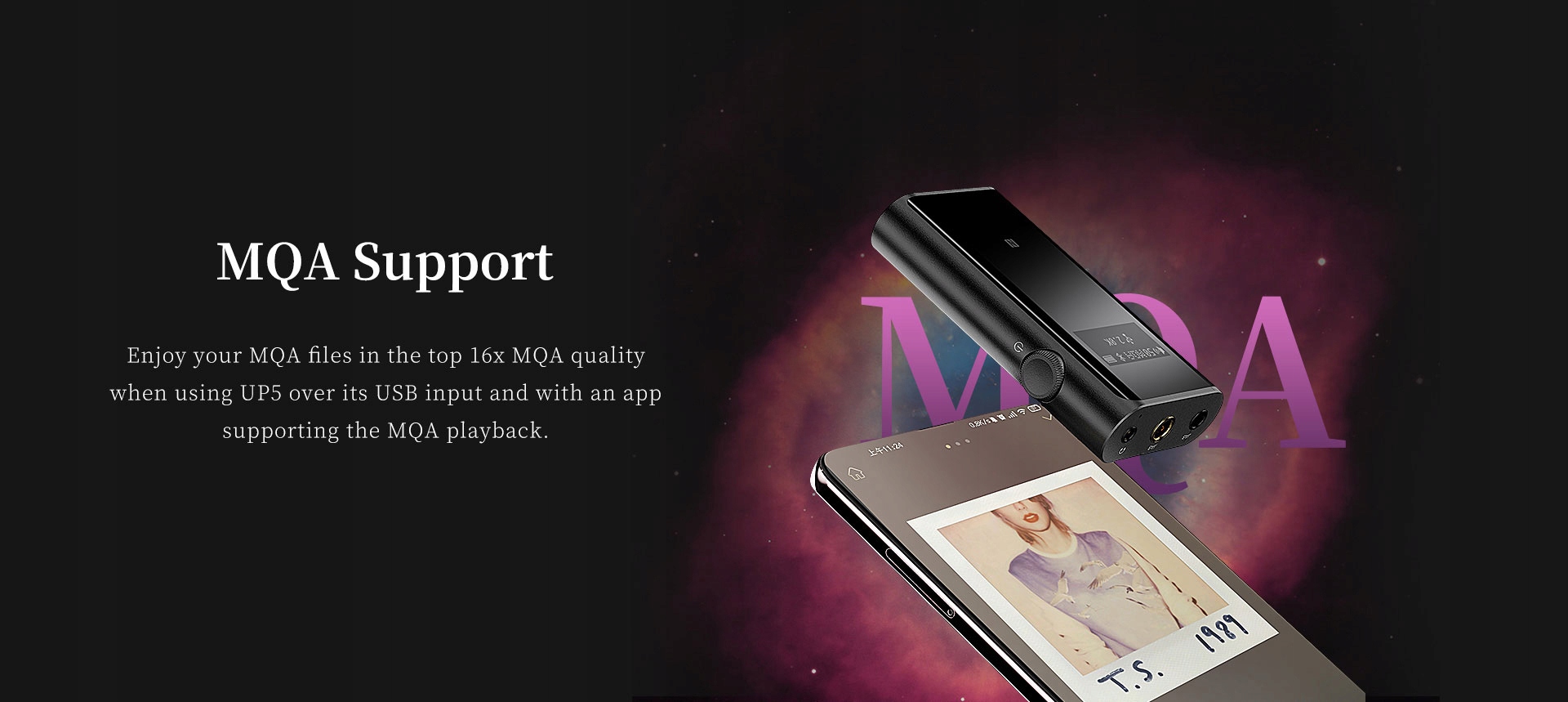 UP5 дополнен аппаратной поддержкой стандарта MQA (Master Quality Authenticated), поэтому пользователи могут наслаждаться записями более высокого качества, которые полностью отражают замыслы исполнителей. . Он также гарантирует полную поддержку этой технологии, которая позволяет воспроизводить файлы MQA с 16-кратным рендерингом (только для USB-соединения в сочетании с приложением, поддерживающим воспроизведение MQA).