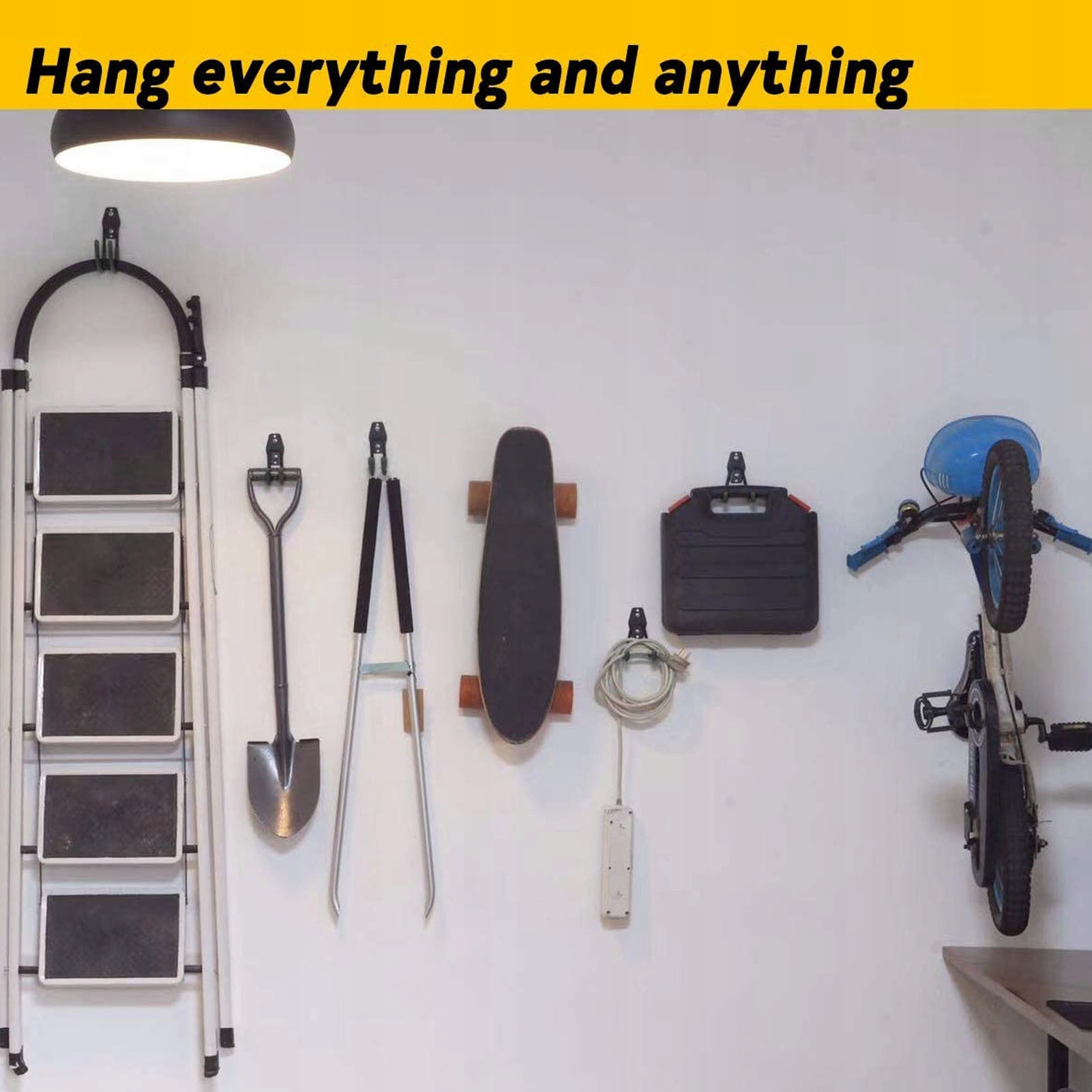 Функция: 1. Многие отверстия: двойной набор крючков содержит 5 различных крючков, для организации электроинструментов, лестниц, массовых предметов, кабельных шлемов, инструментов для садоводства и других.
