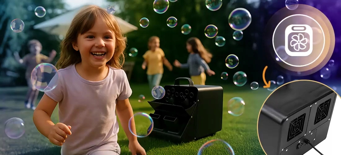MM-BB400 использует две эффективные турбины, благодаря тому, что вы быстро заполняете пространство тысячами пузырьков мыла. Двойной механизм значительно улучшает производительность и количество производимых пузырьков, что делает устройство быстро создавать впечатляющие визуальные эффекты как дома, так и на больших мероприятиях на открытом воздухе. Две турбины также имеют равномерное распределение пузырьков, благодаря которой все пространство заполнено блестящими размышлениями, подчеркивая атмосферу каждого социального собрания.