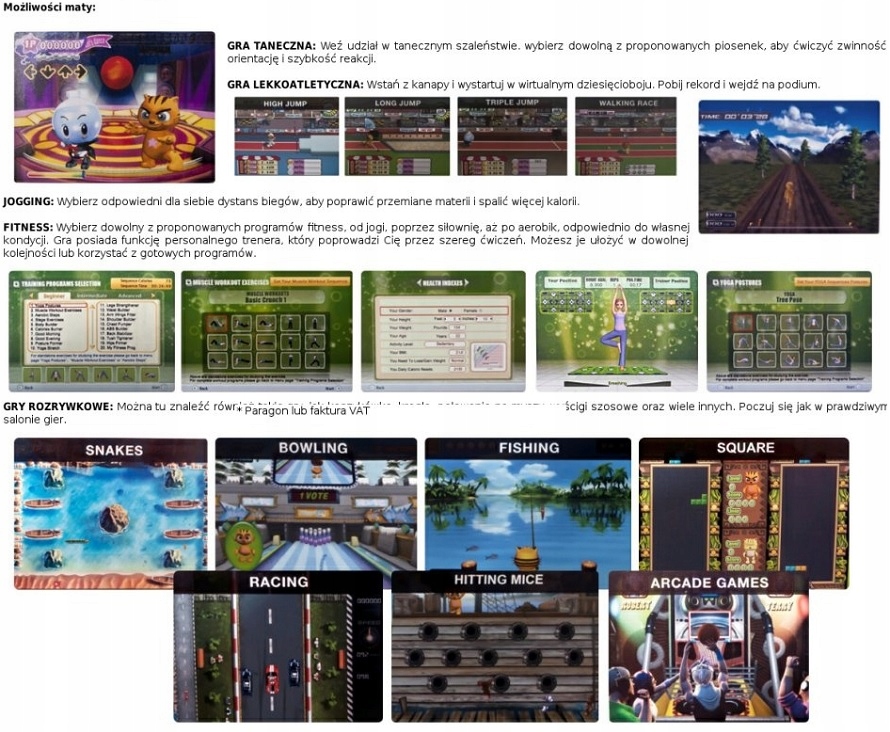 - Коврик поставляется с 4 различными категориями игр, которые транслируются по телевизору: спортивные игры (Олимпиада), танцевальные игры, аркадные игры, йога, фитнес!