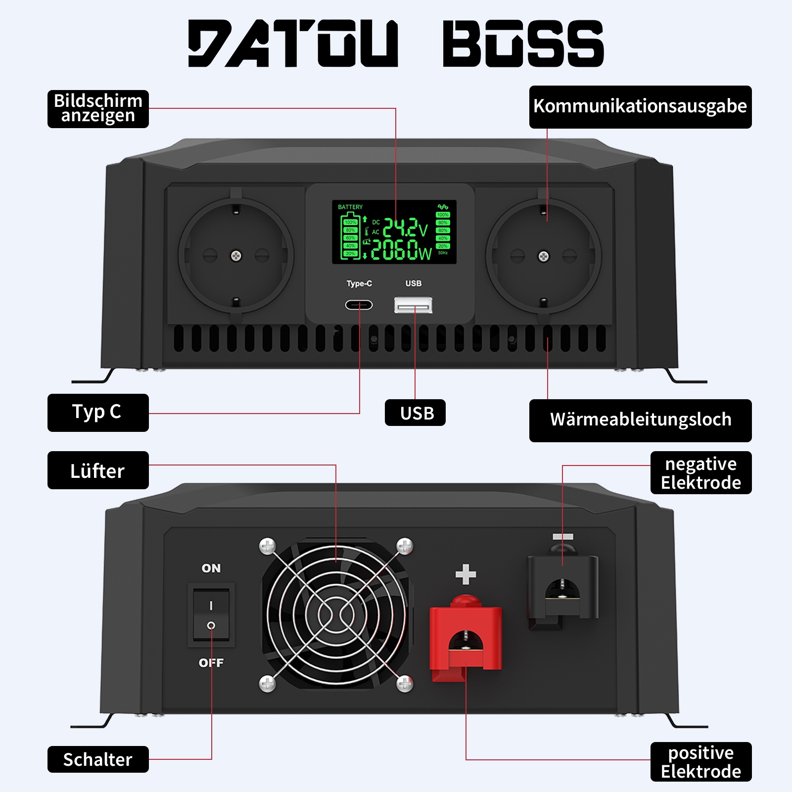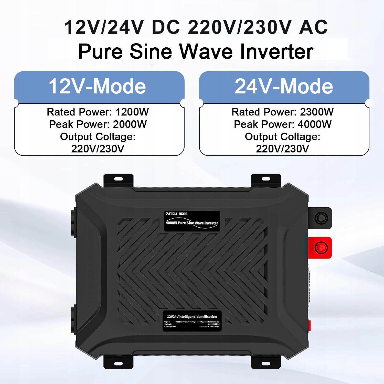 2. Вы можете подключить батареи 12 В и 24 В. Когда инвертор подключен к аккумулятору с 12 В, номинальная мощность составляет 1200 Вт, а пиковая мощность 2000 Вт. После подключения к батарею 24 В номинальная мощность может достигать 2300 Вт, а пиковая мощность составляет 4000 века, инвертор оснащен многими защитными функциями, включая перегрузку, чрезмерную температуру, высокий напряжение, низкий уровень, короткий коровный корыж.