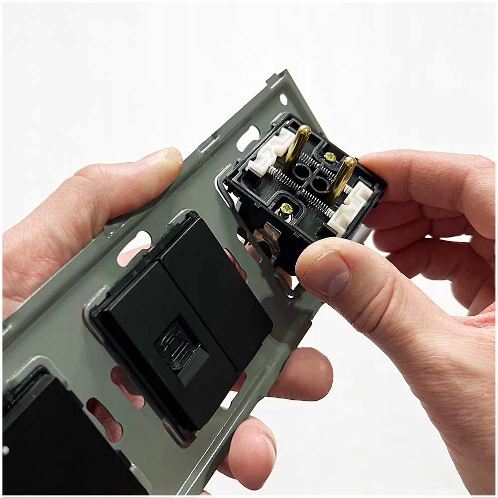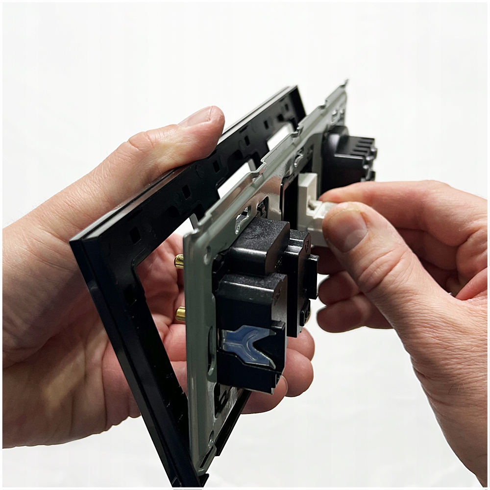 Сборка модуля в каркасе очень проста. На фотографиях представлен пример монтажа модуля в тройной рамке. Все модули (розетки, выключатели) в каркасах монтируются одинаково:
