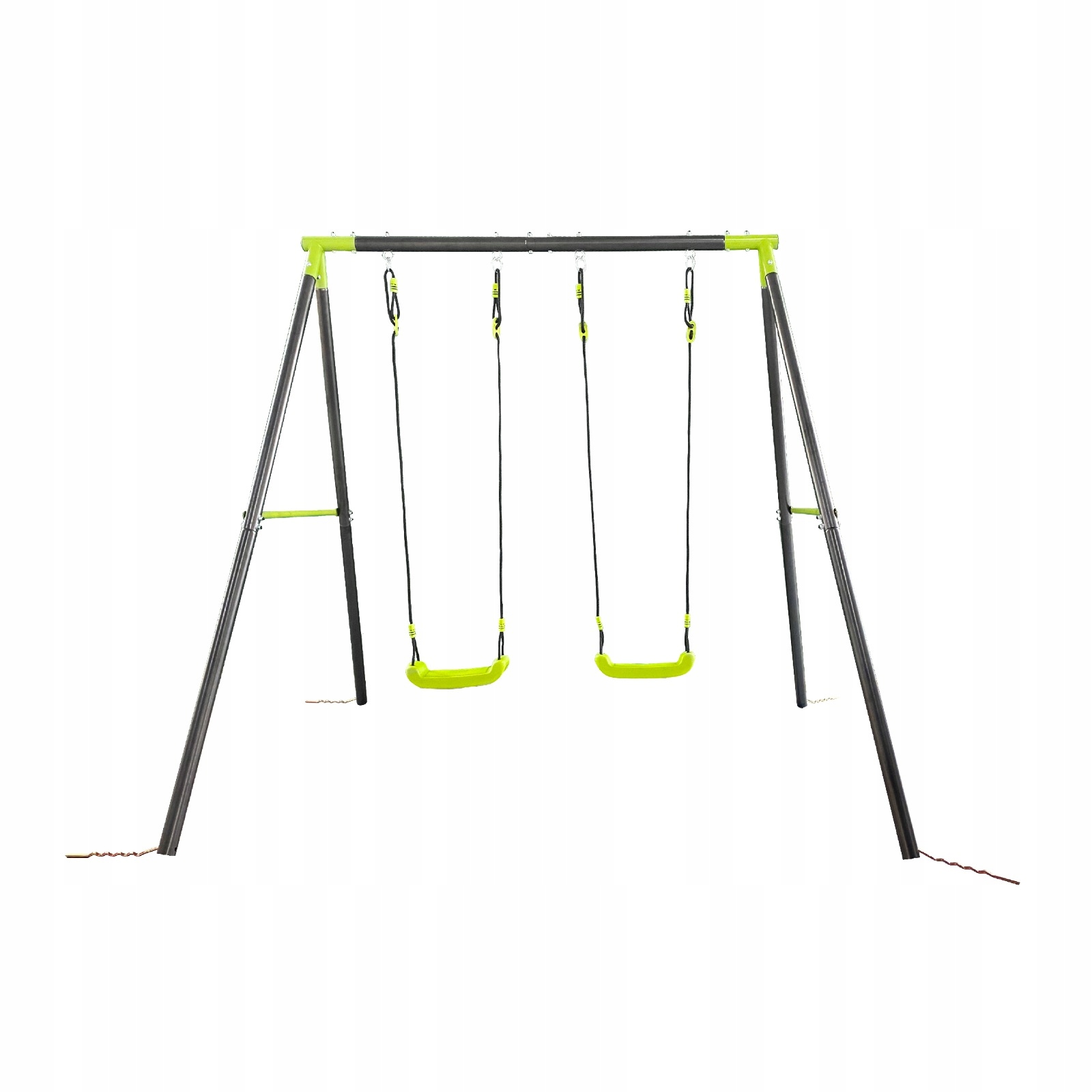 Swing Swing для детей часто завершает счастье детей в саду. Двойной свинг производится на стабильной металлической основе. Это обеспечивает безопасность и долговечность набора.
