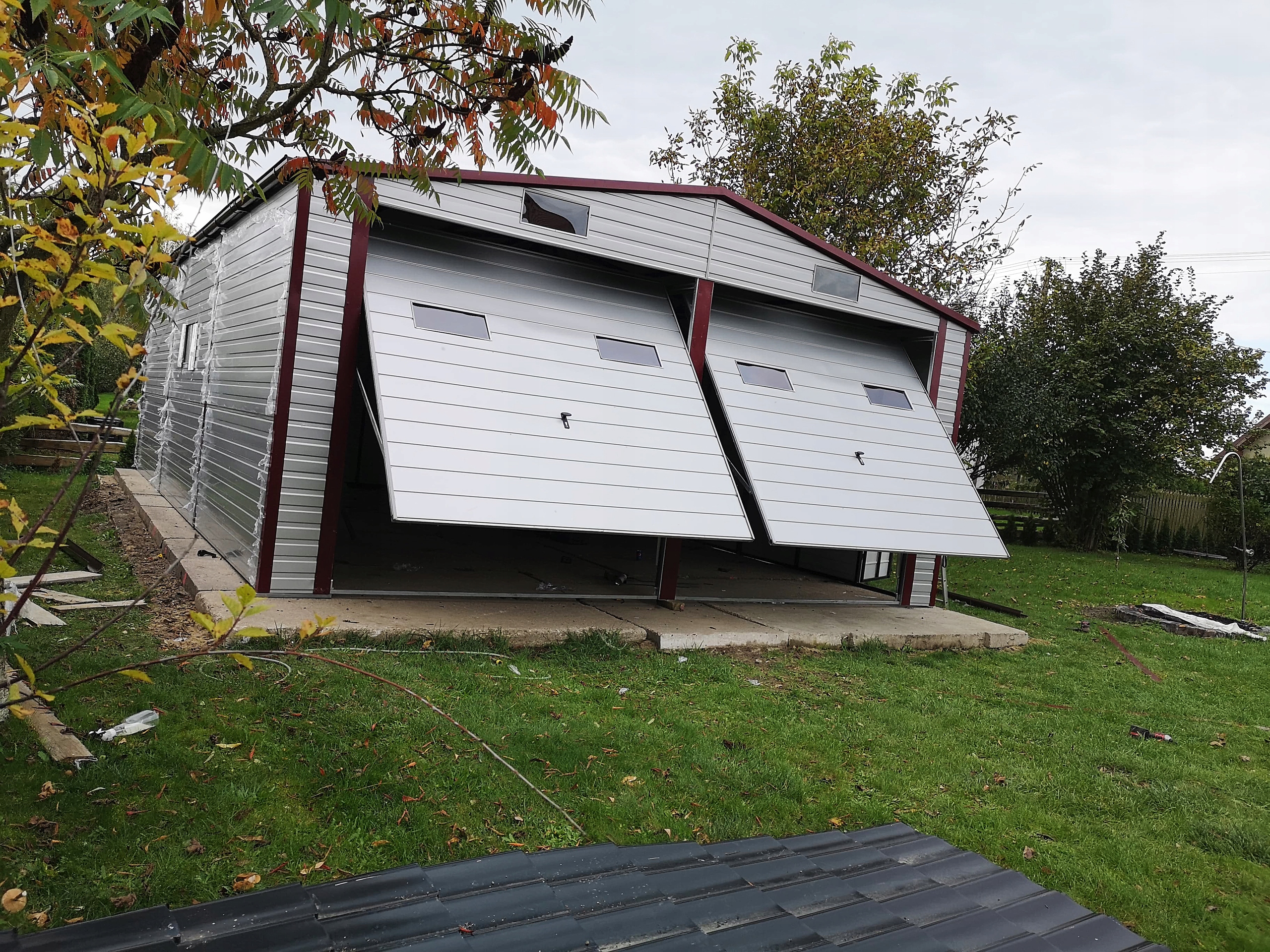 Гараж В здании из листового металла установлены двое открывающихся вверх ворот, окрашенных в цвет гаража или из палитры RAL.
