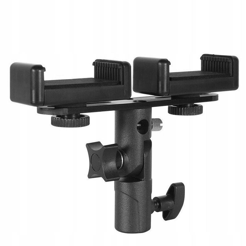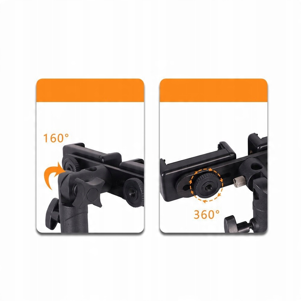 Двойной держатель для телефона со штативом идеально подходит для проведения прямых трансляций или трансляций на две разные платформы. Держатель имеет два крепления с резьбой 1/4 дюйма, поэтому к нему можно прикрепить головку для телефона или спортивную камеру. Вы также можете поместить телефон в одно крепление, а лампу в другое. . Использование держателя зависит от вас. Небольшие размеры означают, что он не занимает много места на столе.