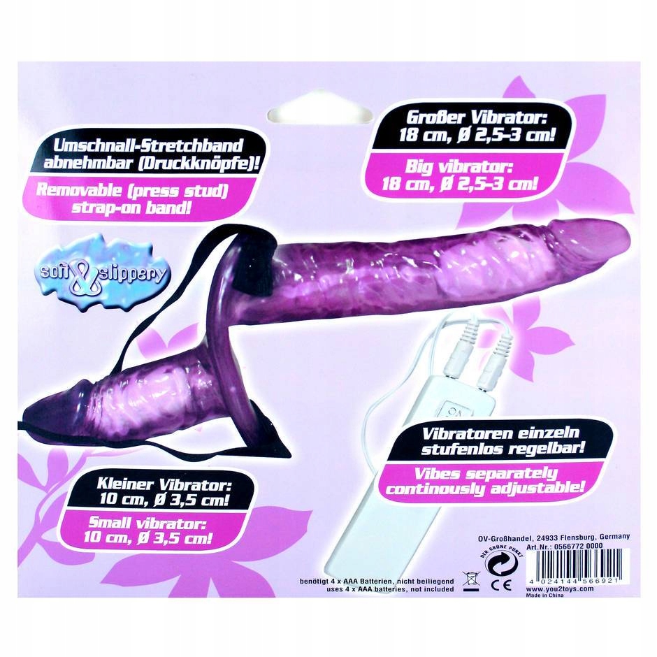 Двойной протез пениса с ремнями, изготовленный из приятного для кожи и мягкого желеобразного материала фиолетового цвета.