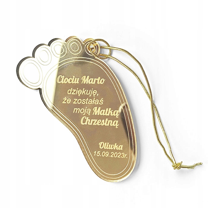 Золотые ножки с выгравированным именем матери Крестная/Крестный отец , имя крещеного ребенка и дата крещения станут незабываемым и долговечным воспоминанием об этом чудесном дне. Ножки из зеркального материала упакованы в красивые декоративные коробки из высококачественной матовой бумаги, окрашенной в массе в БЕЛЫЙ цвет. Крышка декорирована точной лазерной резкой. Внутри находится распечатанное благодарственное письмо Крестной матери/Крестному отцу, украшенное квитанцией.