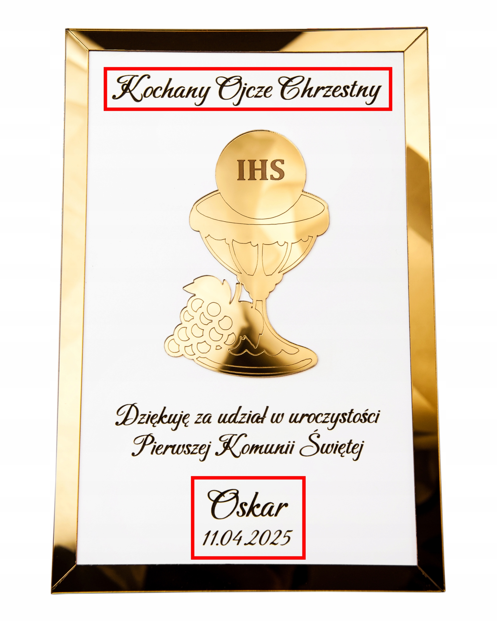 Первое Причастие – особенный момент в жизни ребенка и его семьи. Вы ищете уникальный способ поблагодарить своих крестных или бабушек и дедушек за их присутствие и поддержку в день Первого Причастия? Мы предлагаем элегантную персонализированную табличку с красивым посвящением - это трогательный и вневременной подарок, который уникальным образом выразит благодарность и станет прекрасным воспоминанием об этом таинстве на долгие годы!
