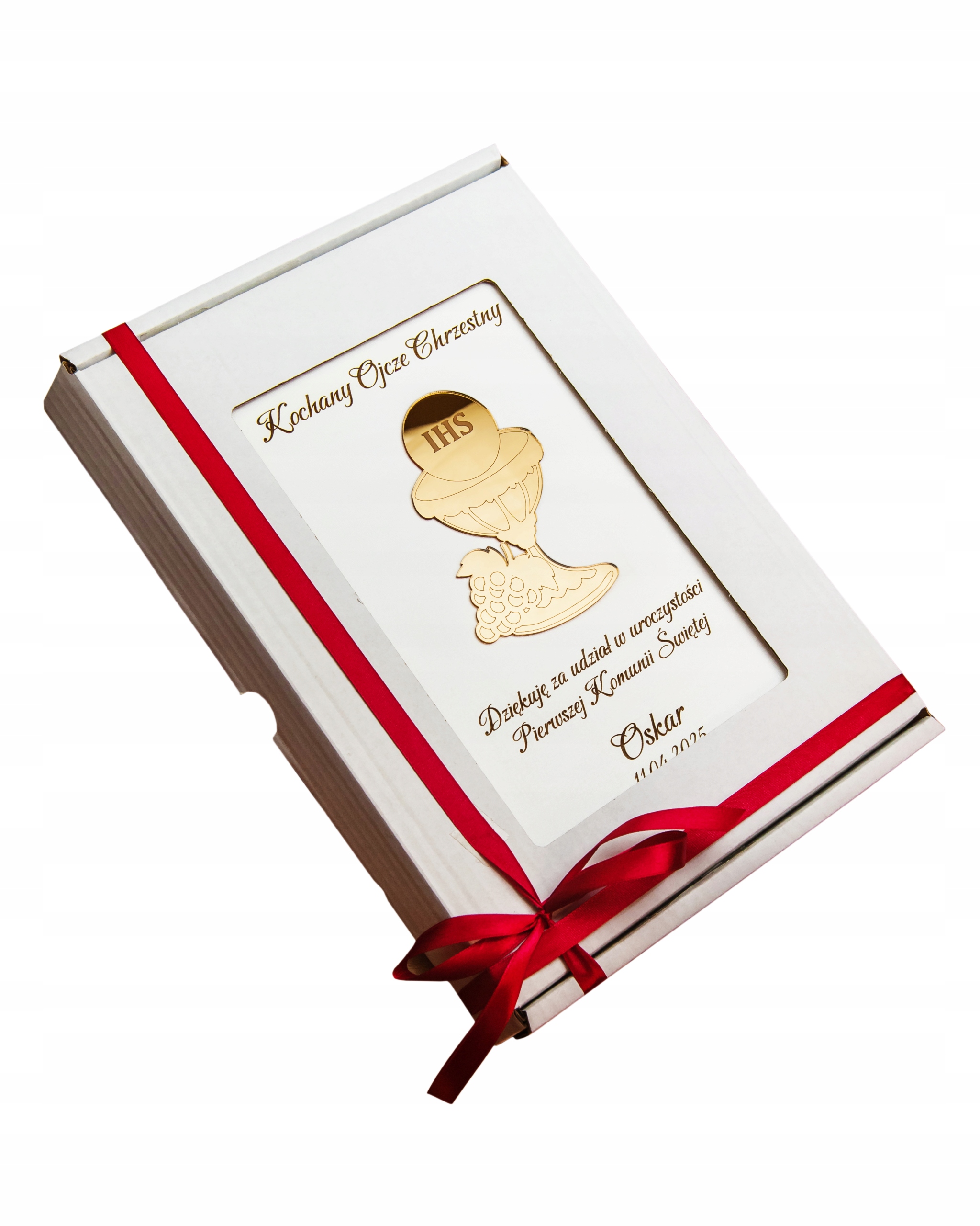 Наш подарок к Первому Святому Причастию упакован в стильную белую коробку и включает в себя декоративную красную ленту, которую можно завязать. Это делает подарок элегантным и готовым к вручению без необходимости использования дополнительной упаковки.