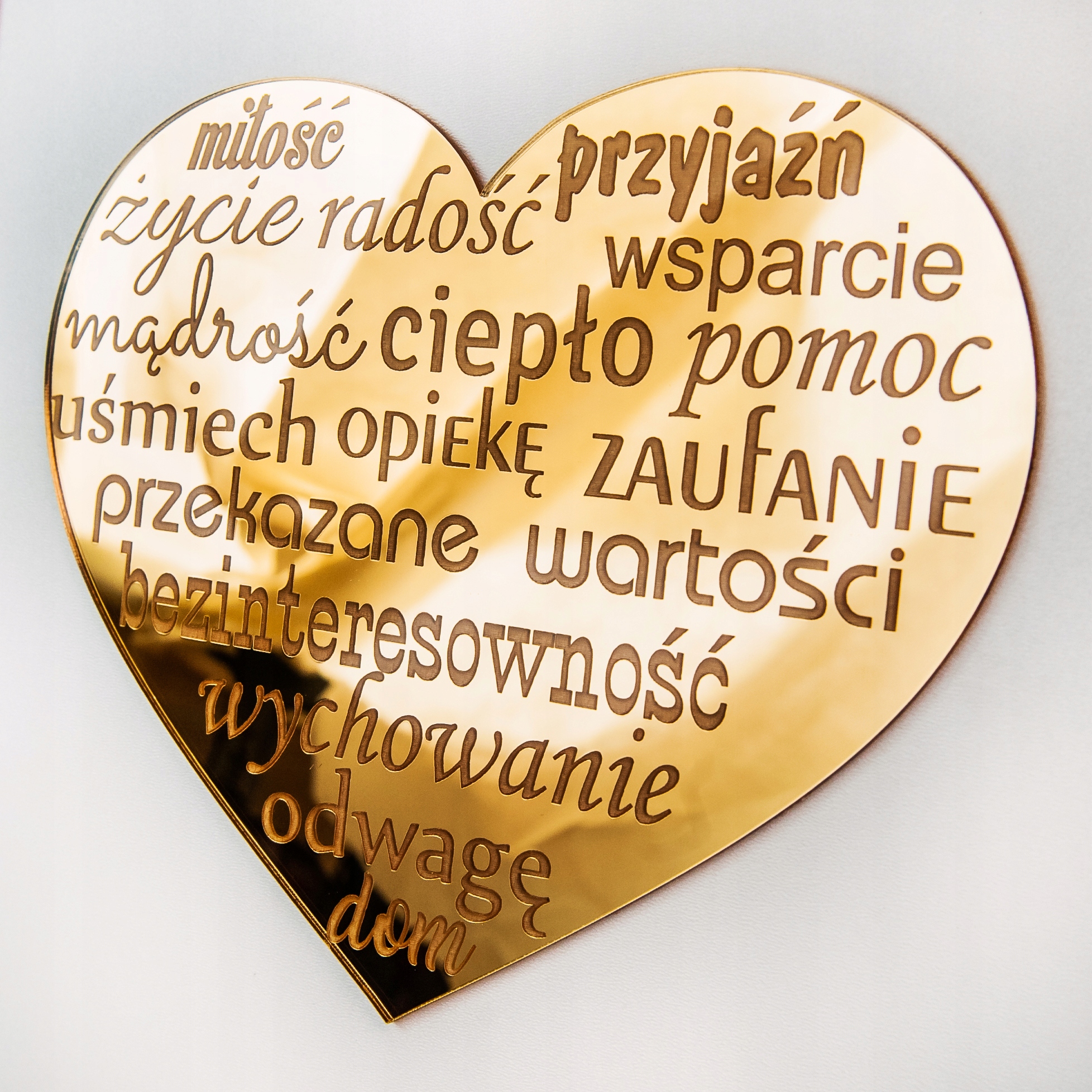 Красивый свадебный сувенир, который также может стать украшением. Надписи сделаны методом лазерной резки из золотого зеркала и наклеены нами на белую плиту МДФ. На сердечке выгравированы слова благодарности.