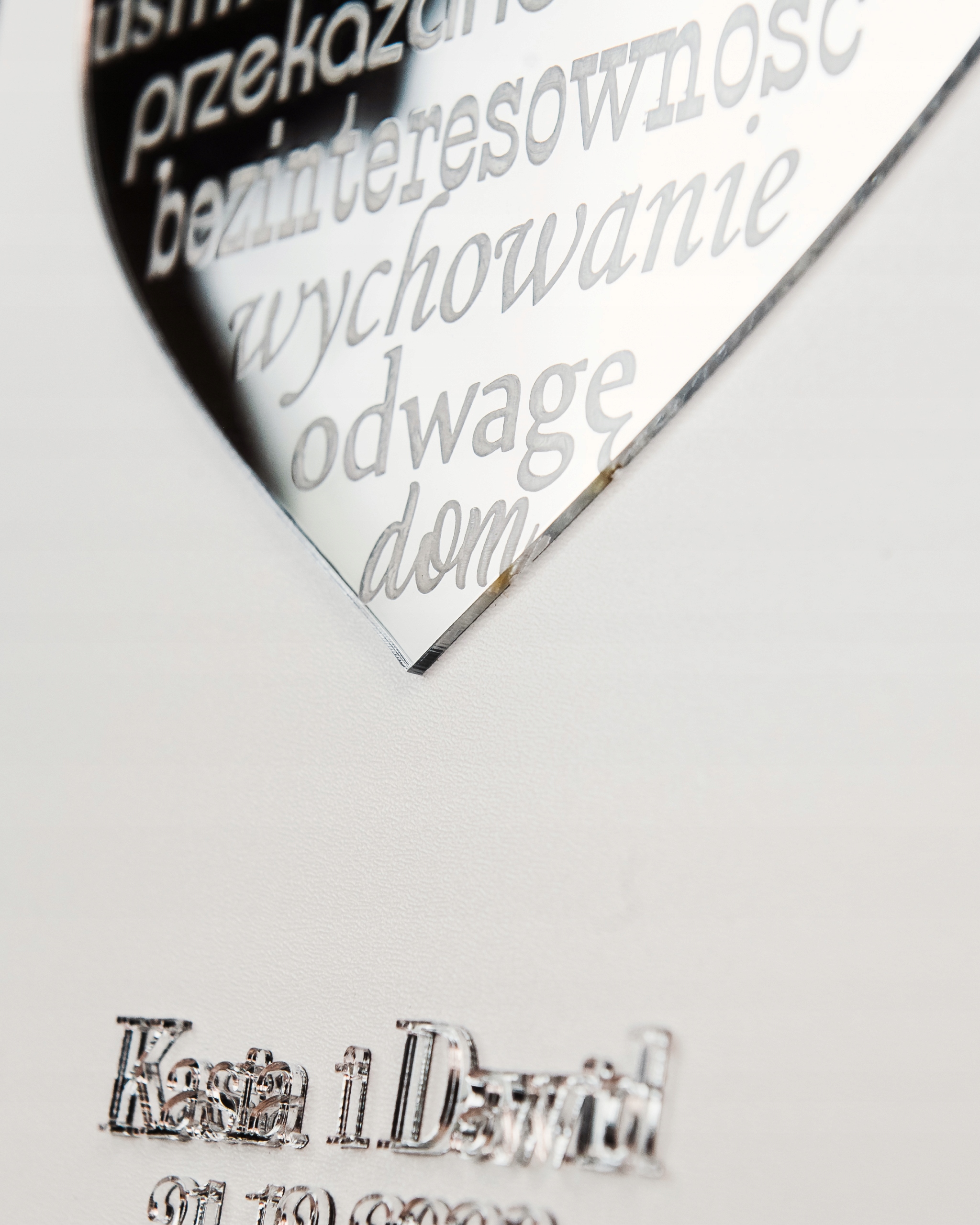 Красивый свадебный сувенир, который также может стать украшением. Надписи сделаны методом лазерной резки из серебряного зеркала и наклеены нами на белую плиту МДФ. Слова благодарности выгравированы на сердечке.