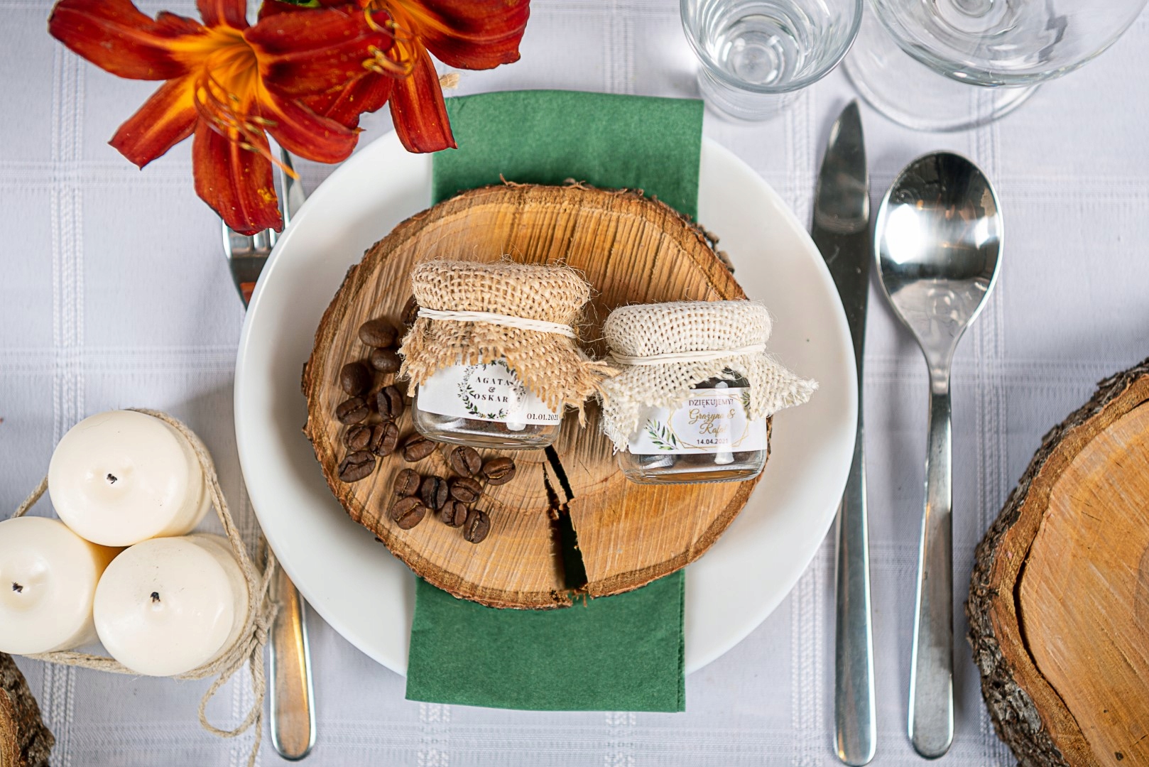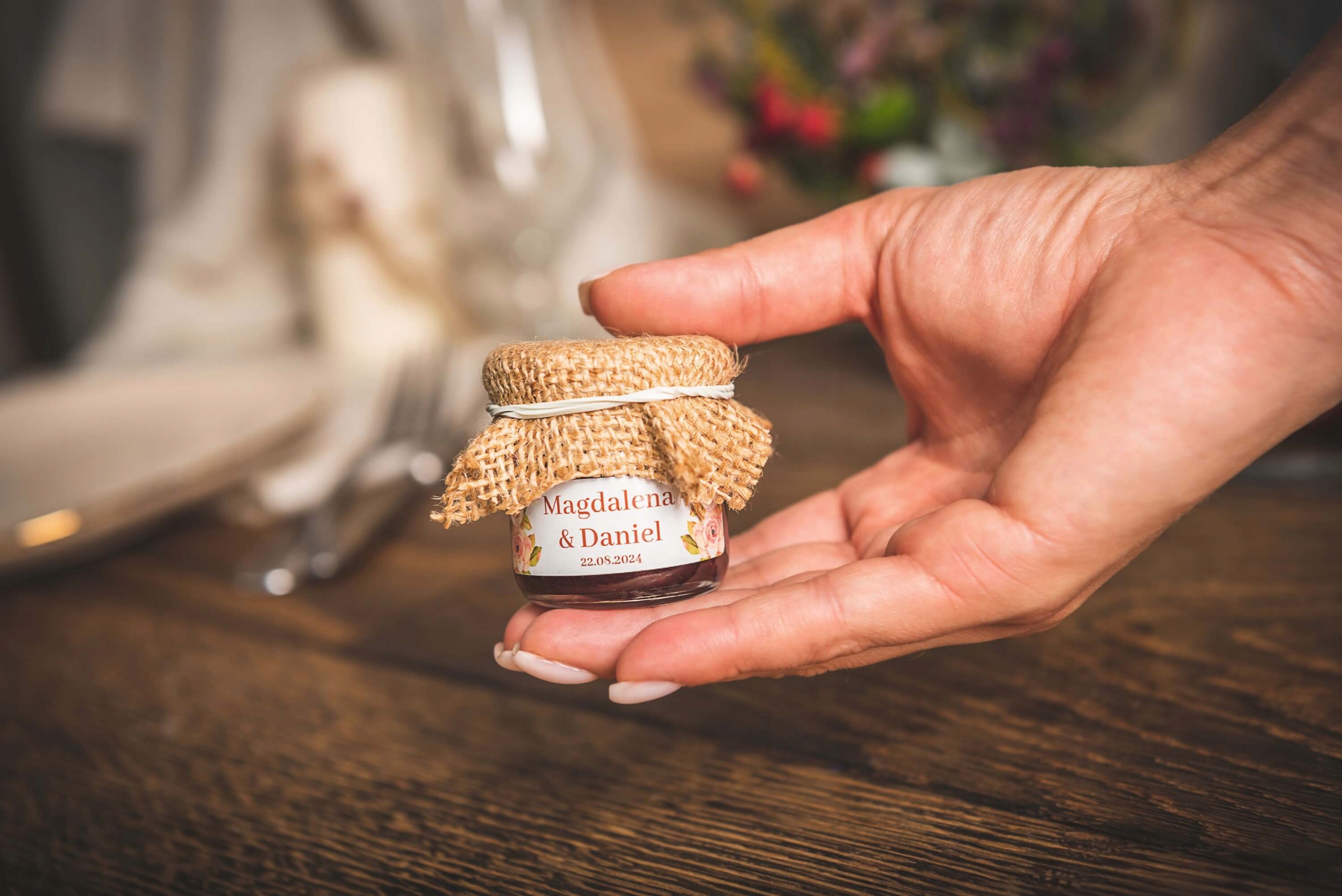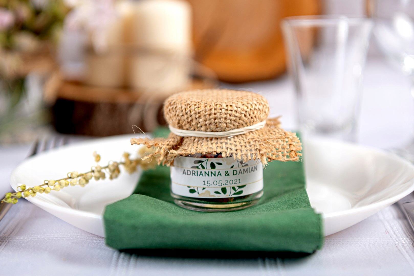 Декоративные банки объемом 40 мл с листовым чаем или молотым кофе с наклейкой и джутовой наклейкой в знак благодарности гостям.