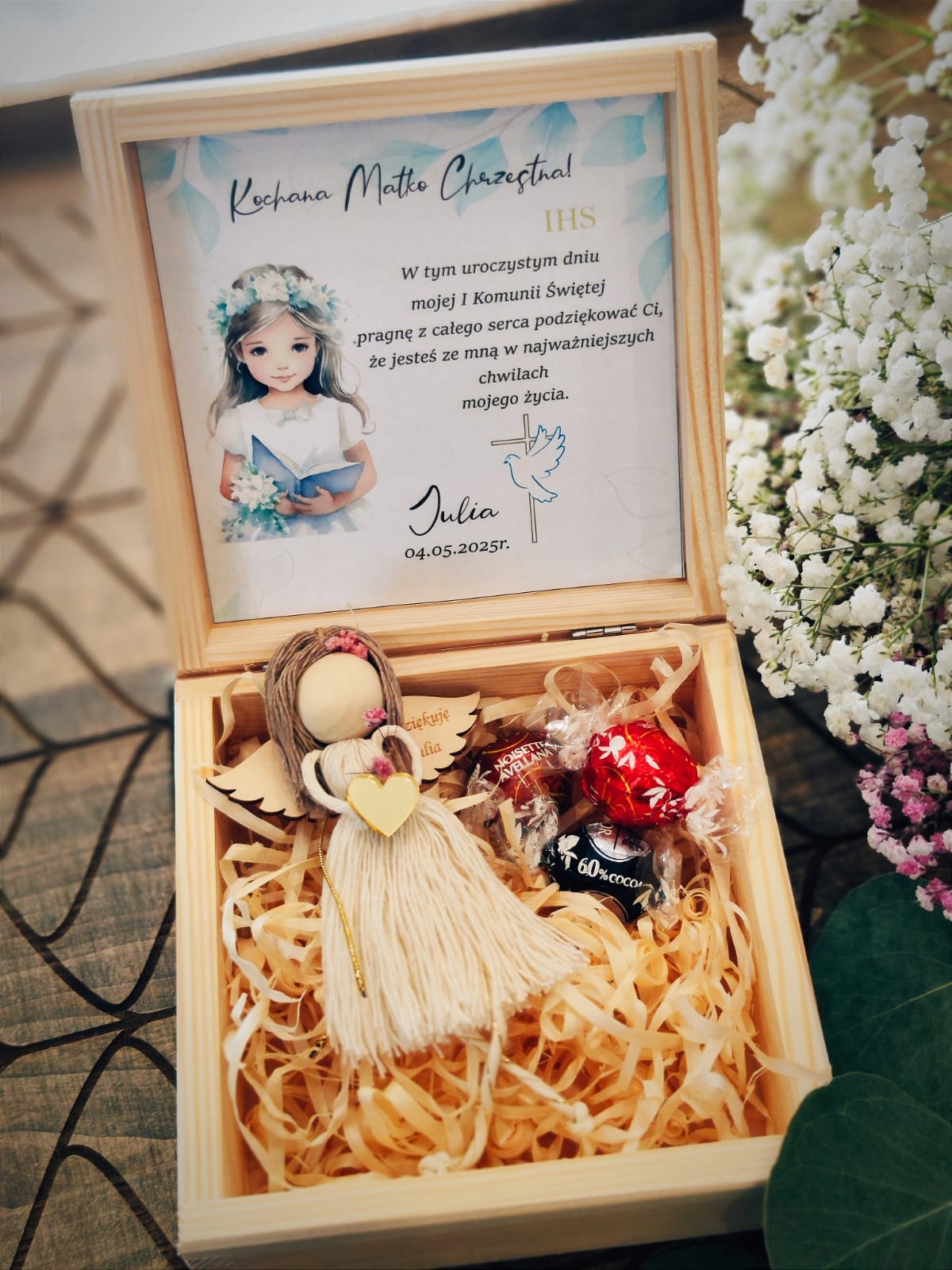 Красивая коробка с шифоновой лентой - спасибо крестным родителям и бабушкам и бабушкам, первое святое причастие!