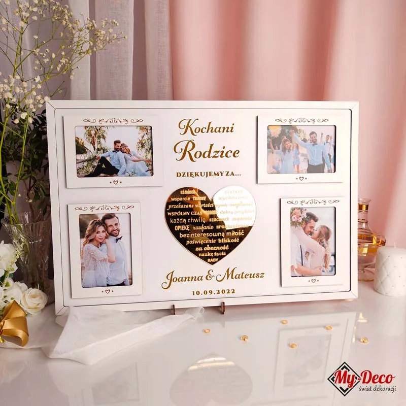 Отличительным элементом этого изделия является выгравированное сердце из акрилового стекла нежных оттенков золота. Он добавляет элегантности и престижа, создавая контраст между белыми рамами и зеркальным оргстеклом. В благодарственном письме также помещается 4 фотографии размером 10х15 - родителей, жениха и невесты. Размер изображения 40х60 см.