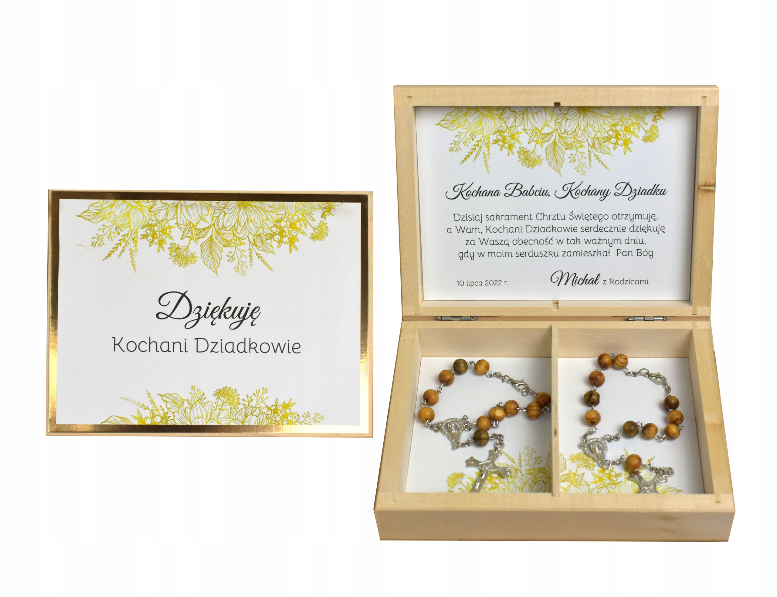 Именный подарок с благодарственным текстом, содержащий десятилетние четки, упакованный в целлофан.