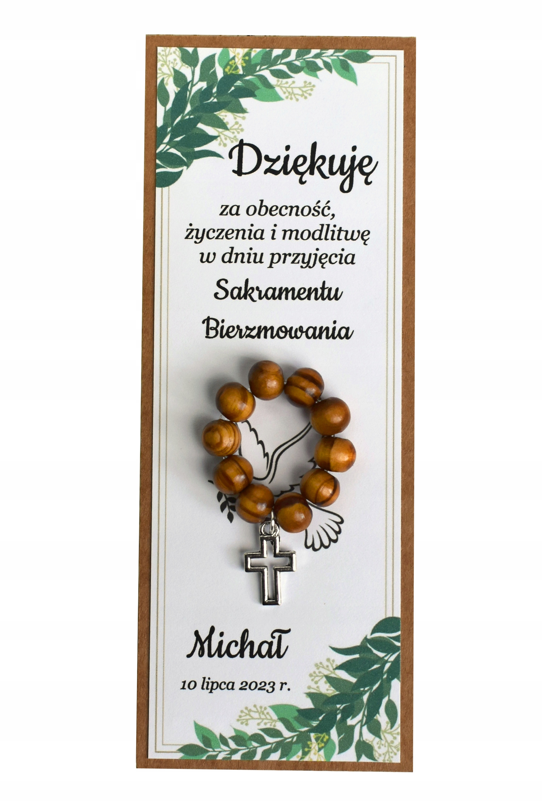 Подарок с именной благодарственной надписью, содержащий десятилетние четки из деревянных бусин и металлический крестик, упакованный в целлофан.