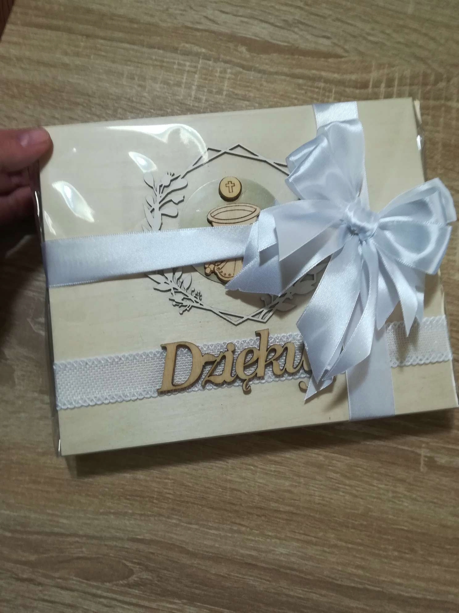 - Сверху коробочка имеет вырезанную из фанеры надпись: Первое Причастие, чаша ИХС, джутовая лента с бантиком и гипсовый ангелочек.