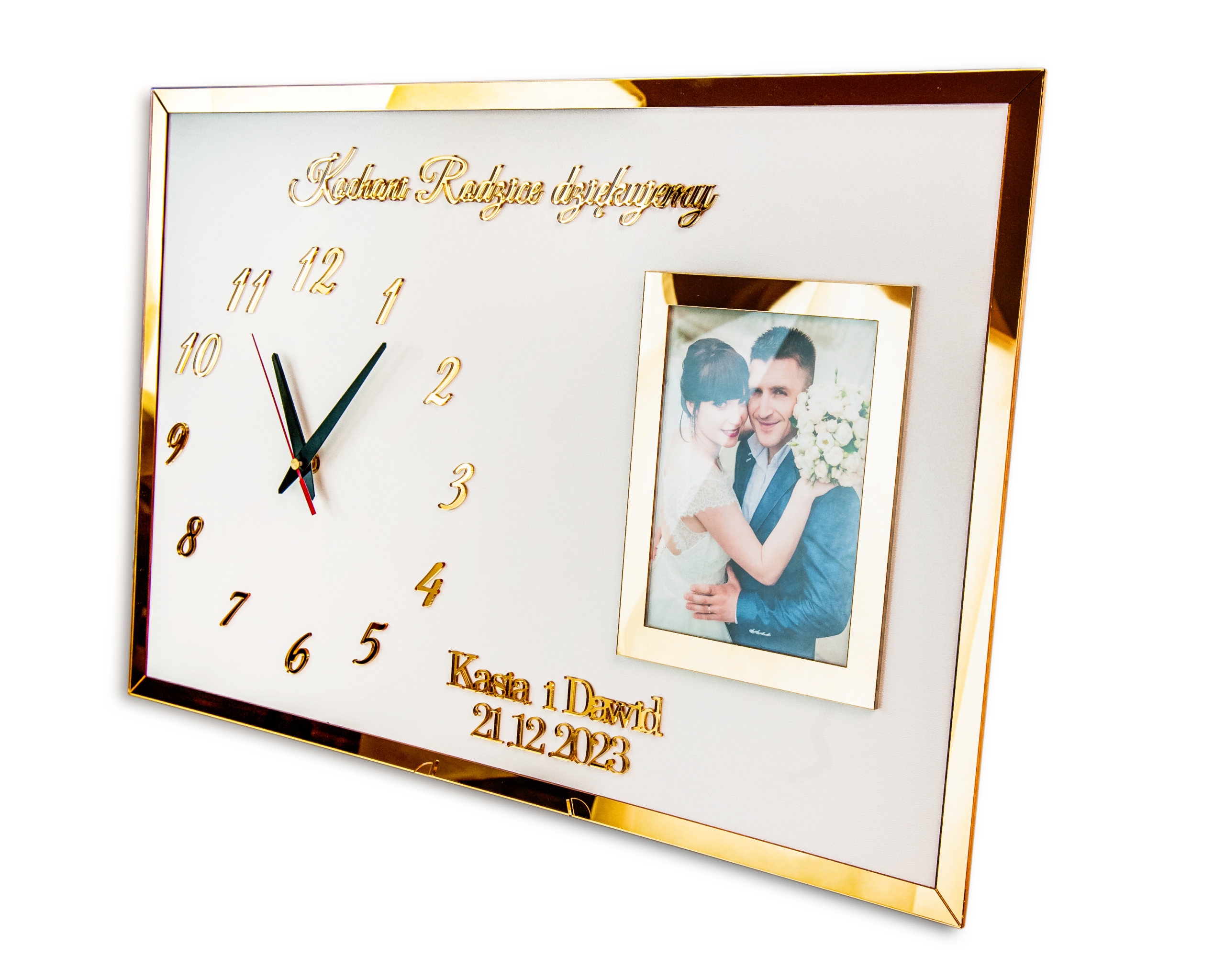 Красивый свадебный сувенир, который также может стать украшением. Надписи сделаны методом лазерной резки из золотого зеркала и наклеены нами на белую плиту МДФ. К доске с благодарностями прикреплены часы.