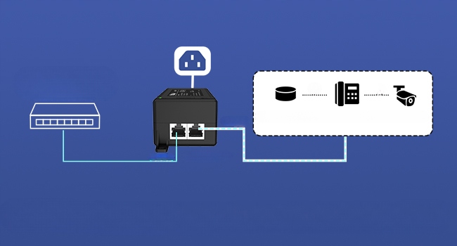 сотрудничает с коллектором POE, чтобы обеспечить мощность и данные для устройств, отличных от POE, в областях без кабелей питания и розеток