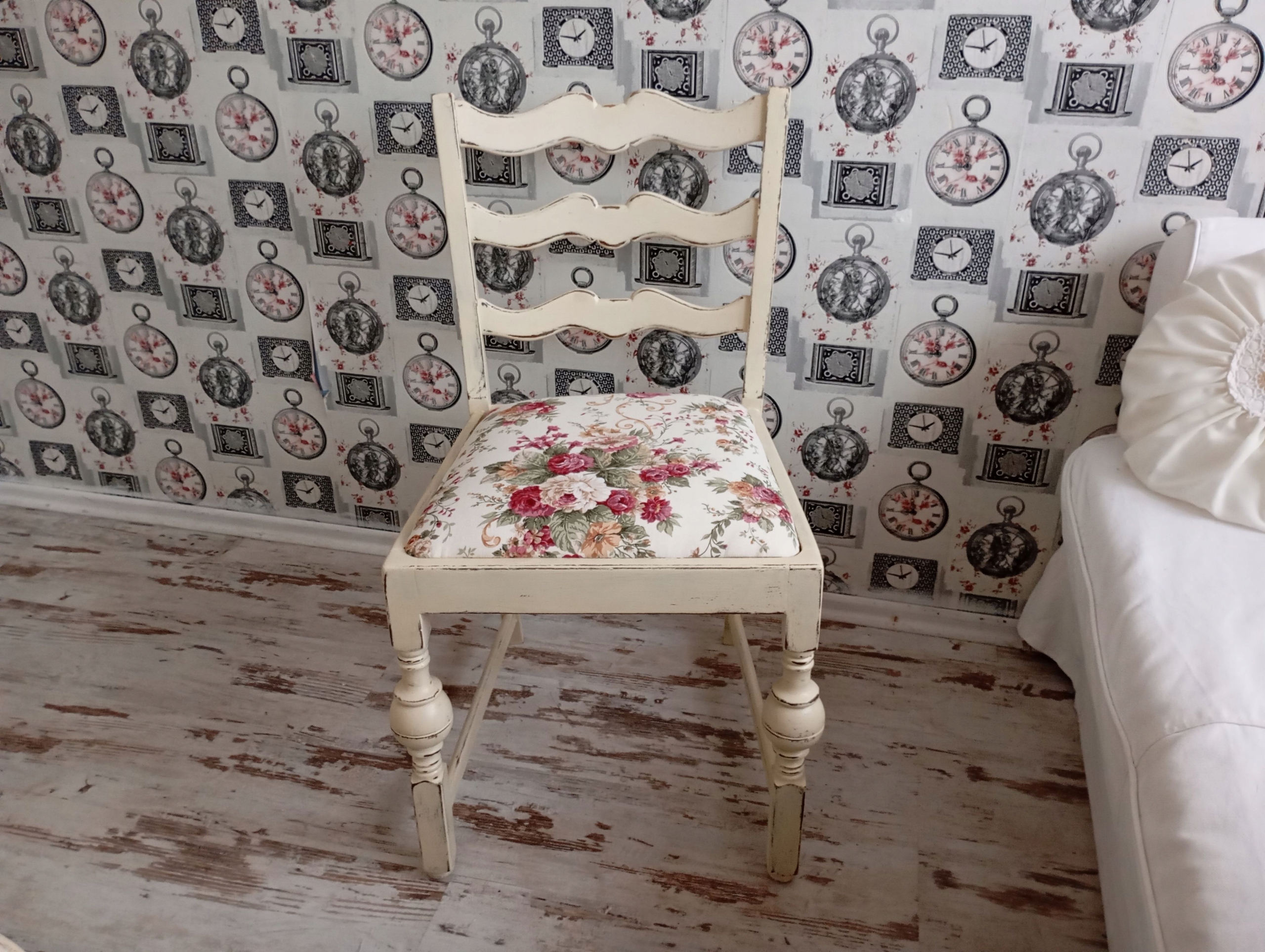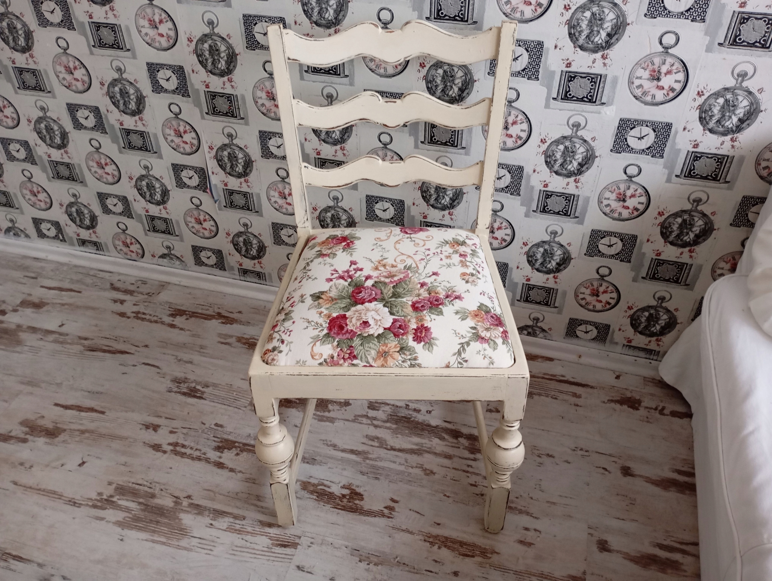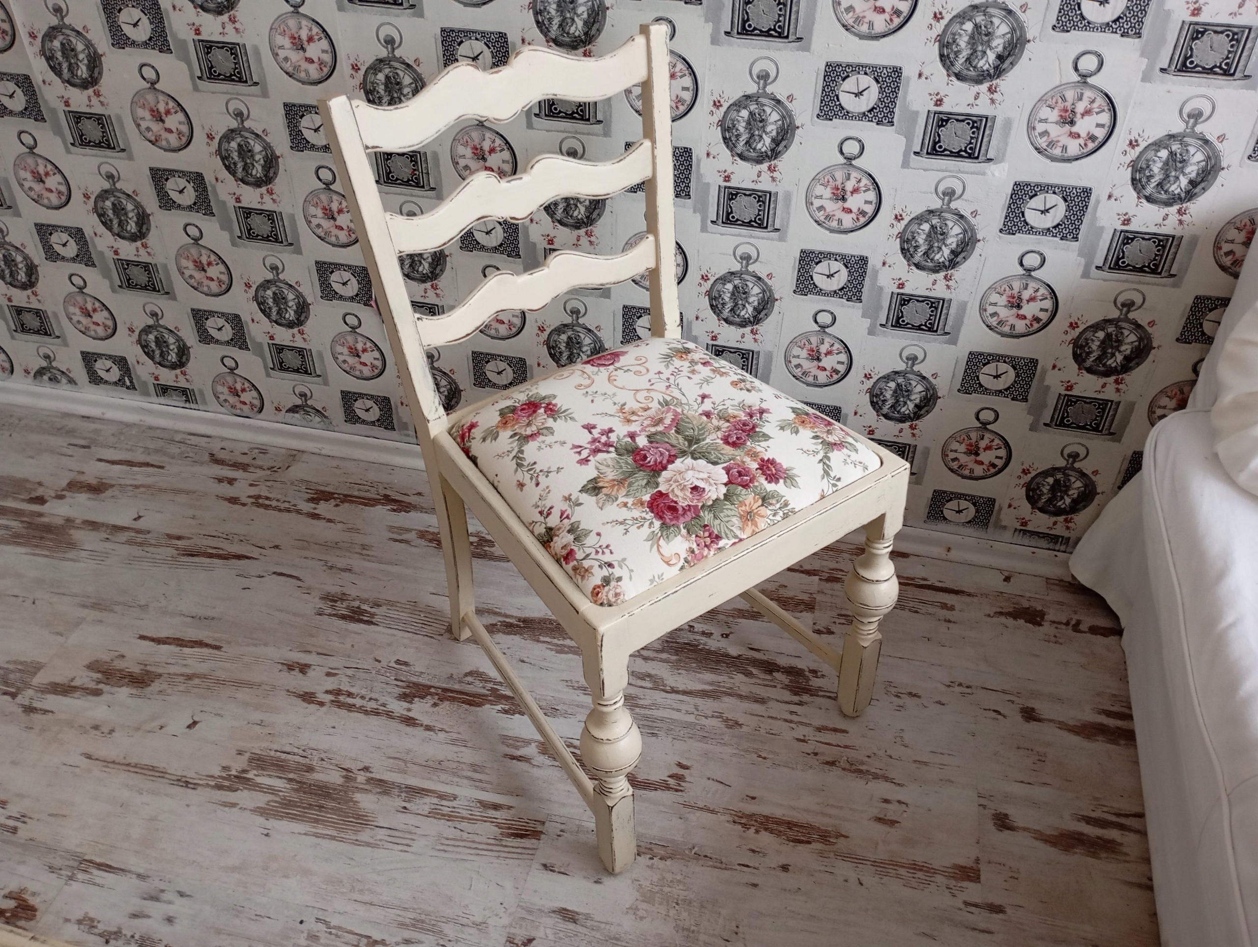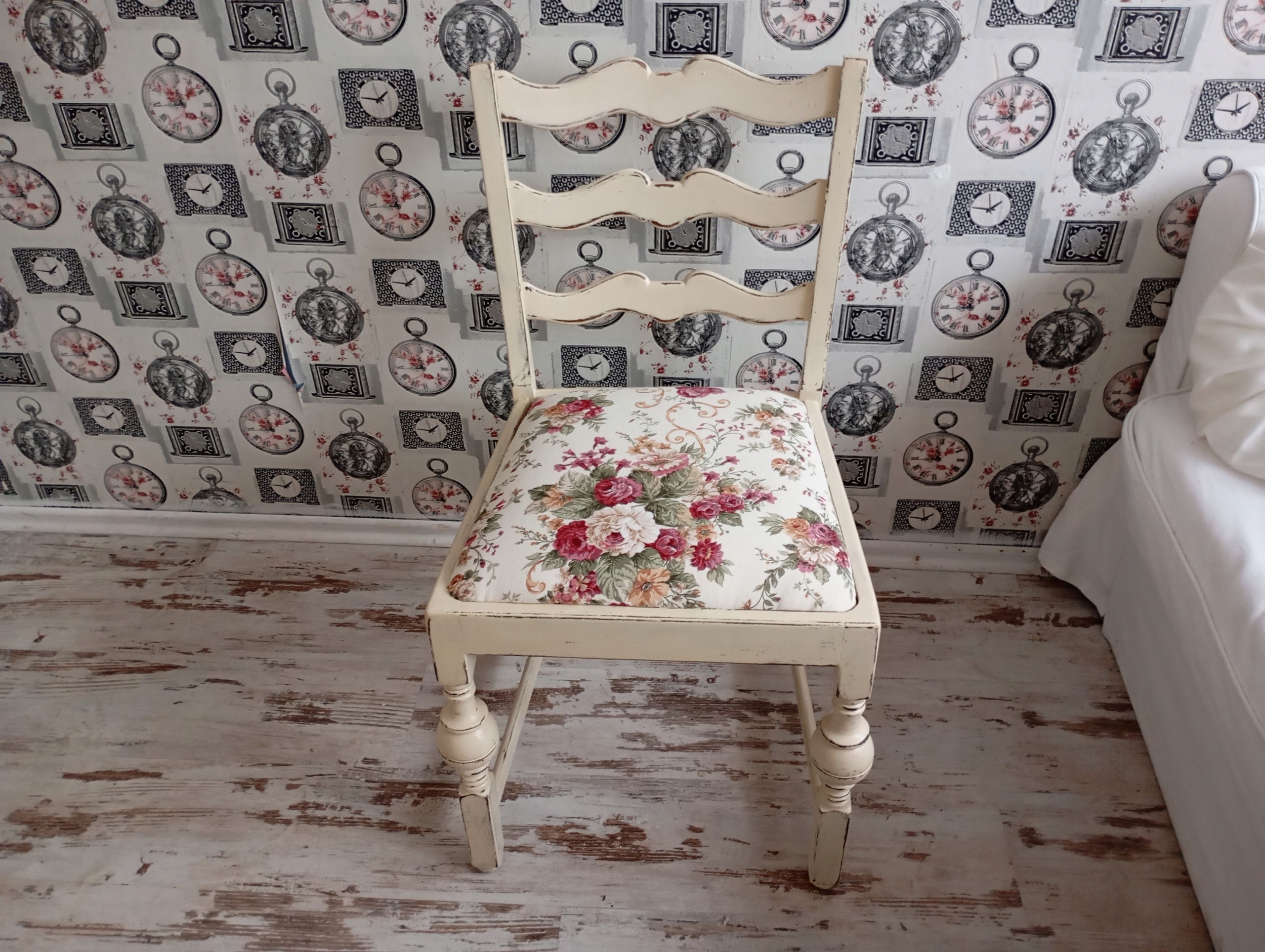 Окрашенный обивший стул, розы, потертые, после обновления