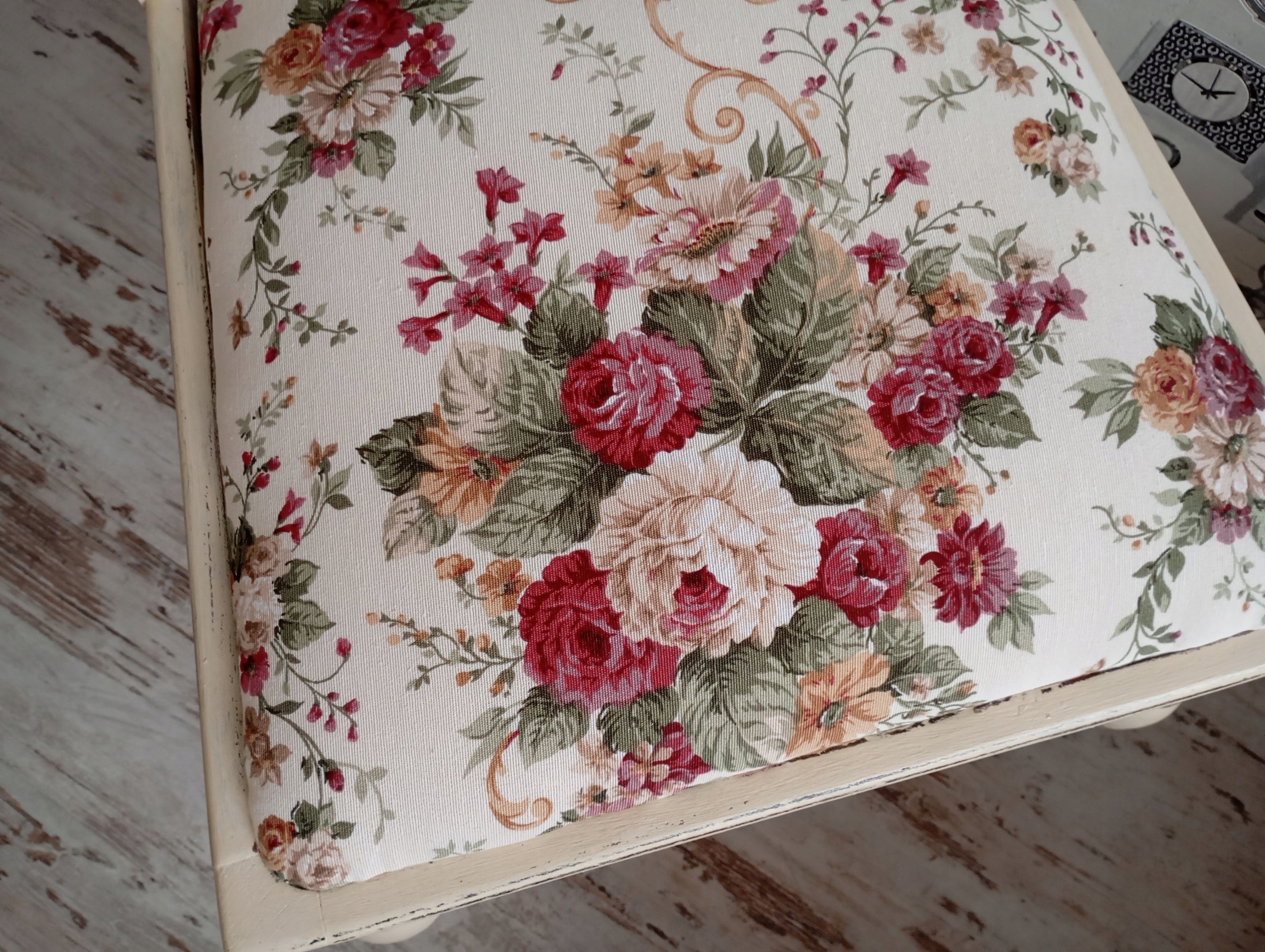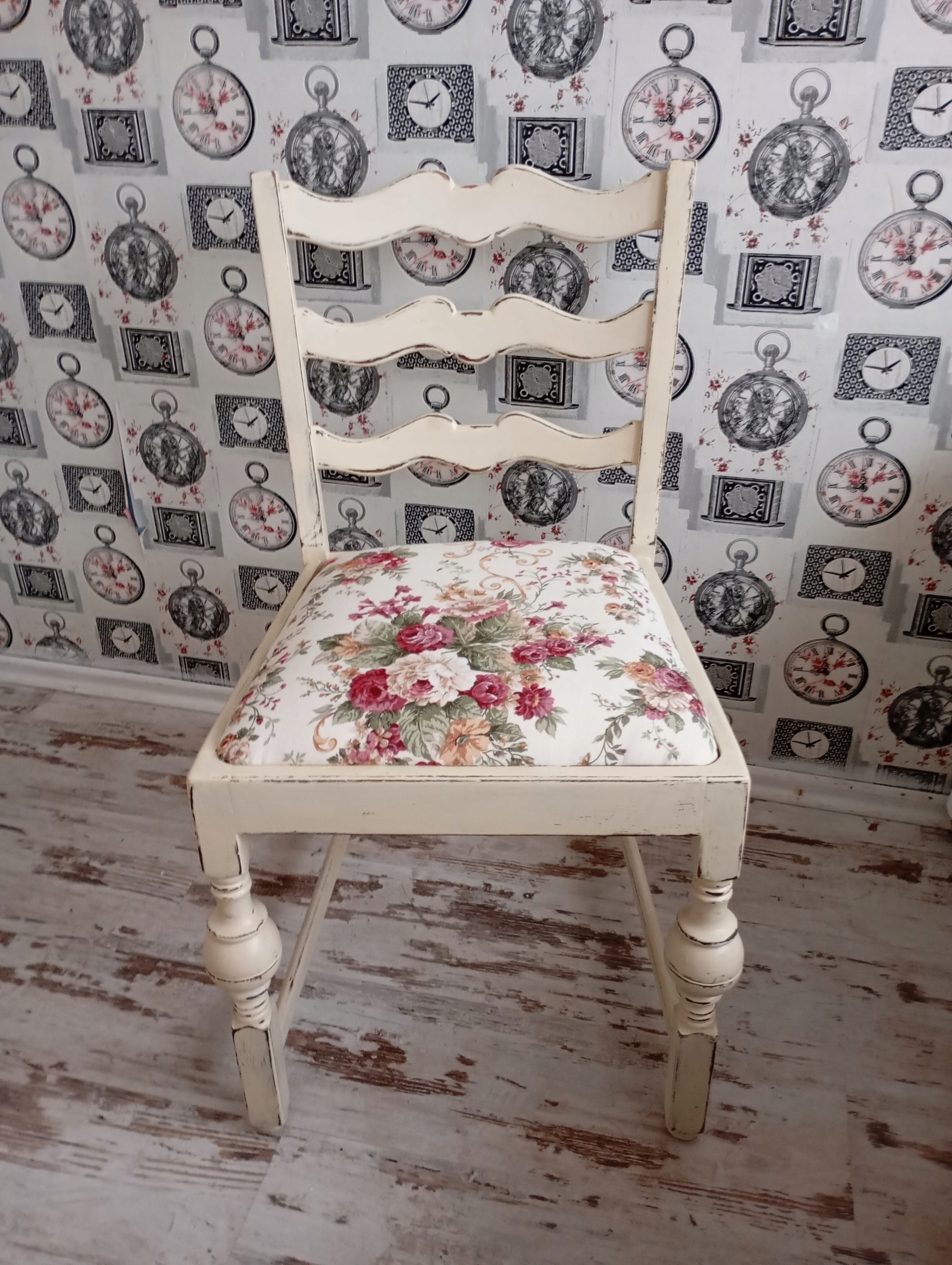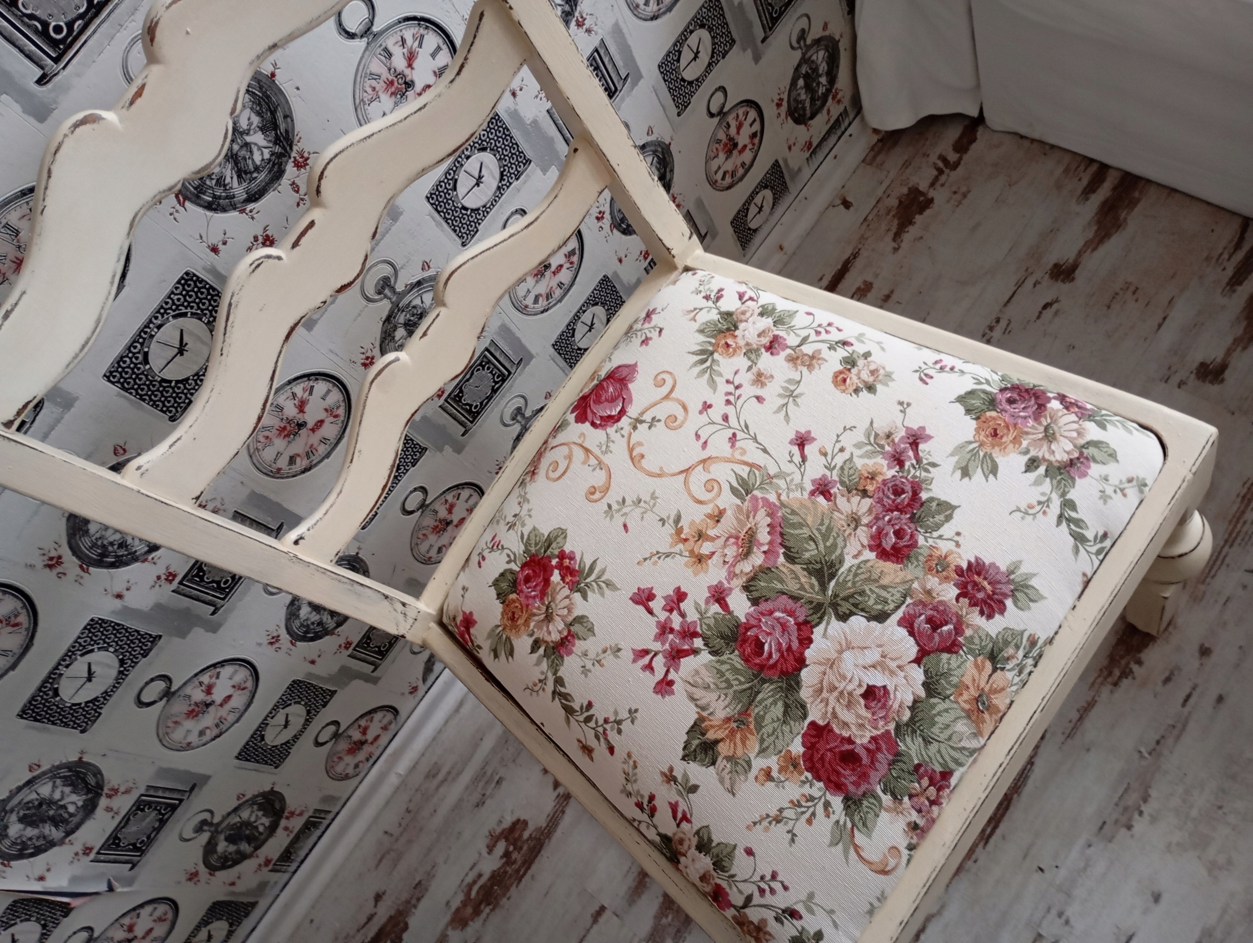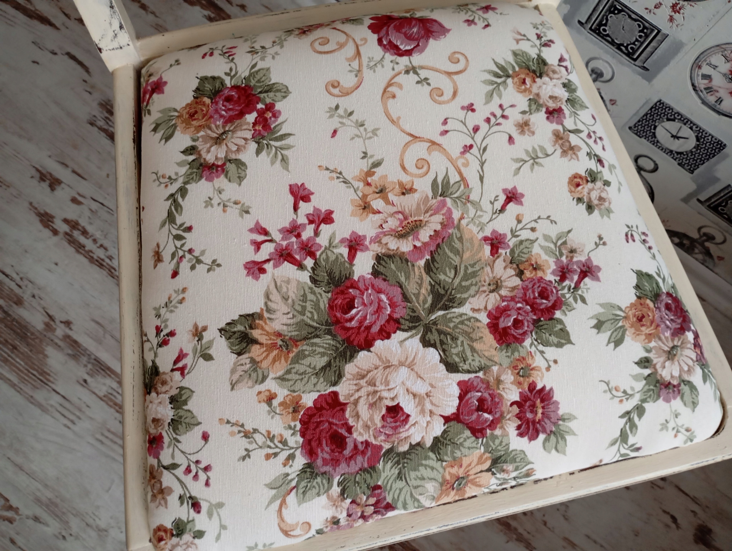 Окрашенный обивший стул, розы, потертые, после обновления