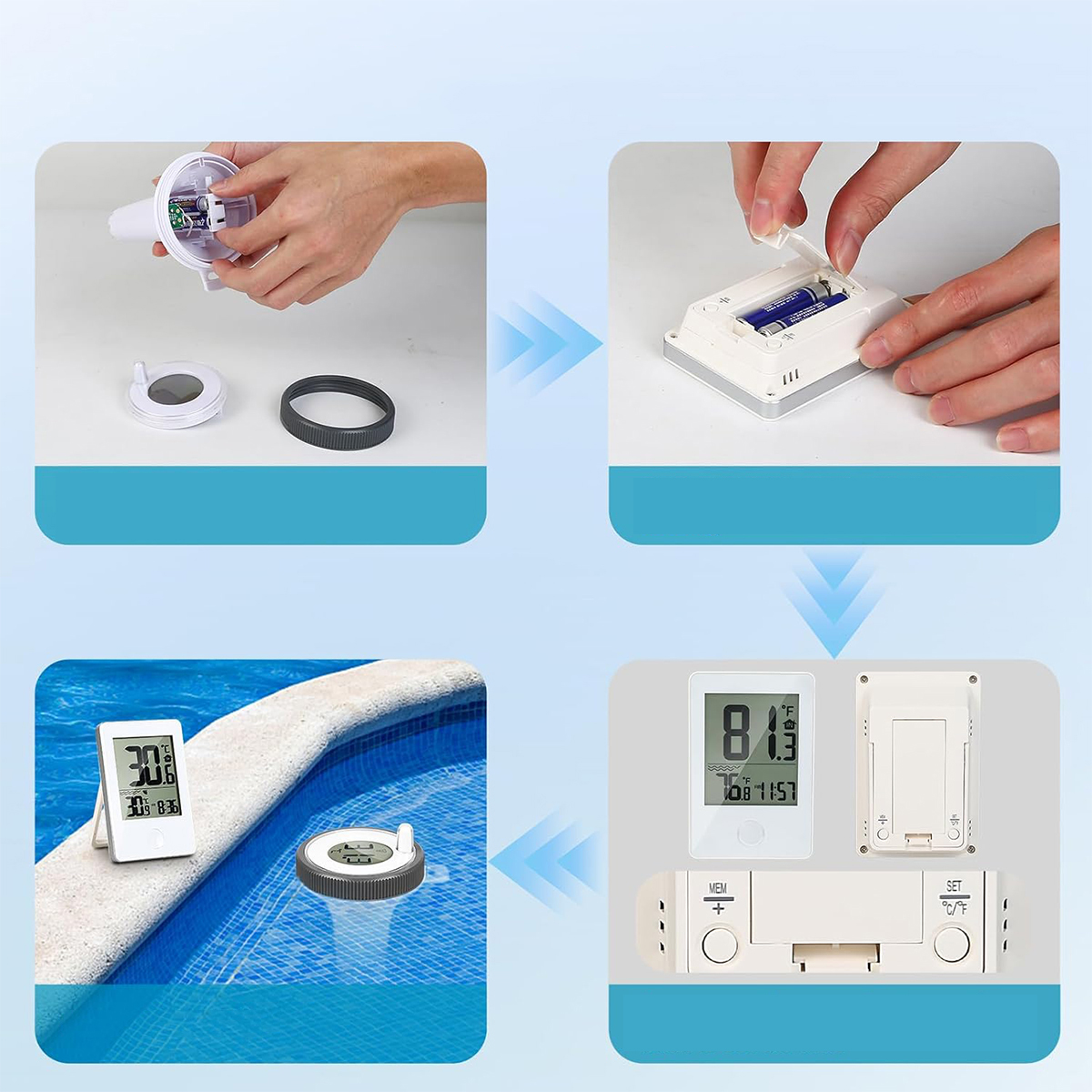 【Различные применения】 Наш беспроводной термометр бассейна подходит для различных применений внутри и снаружи. Его можно использовать в бассейнах, спа, аквариумах, рыбных прудах и других.