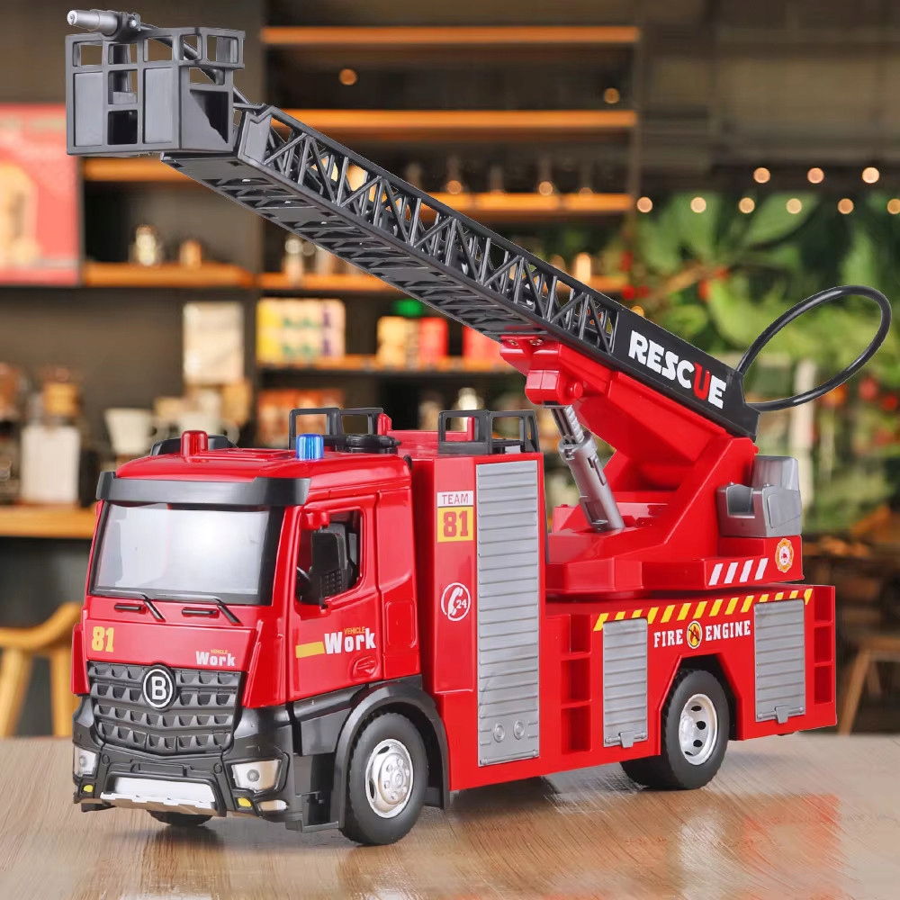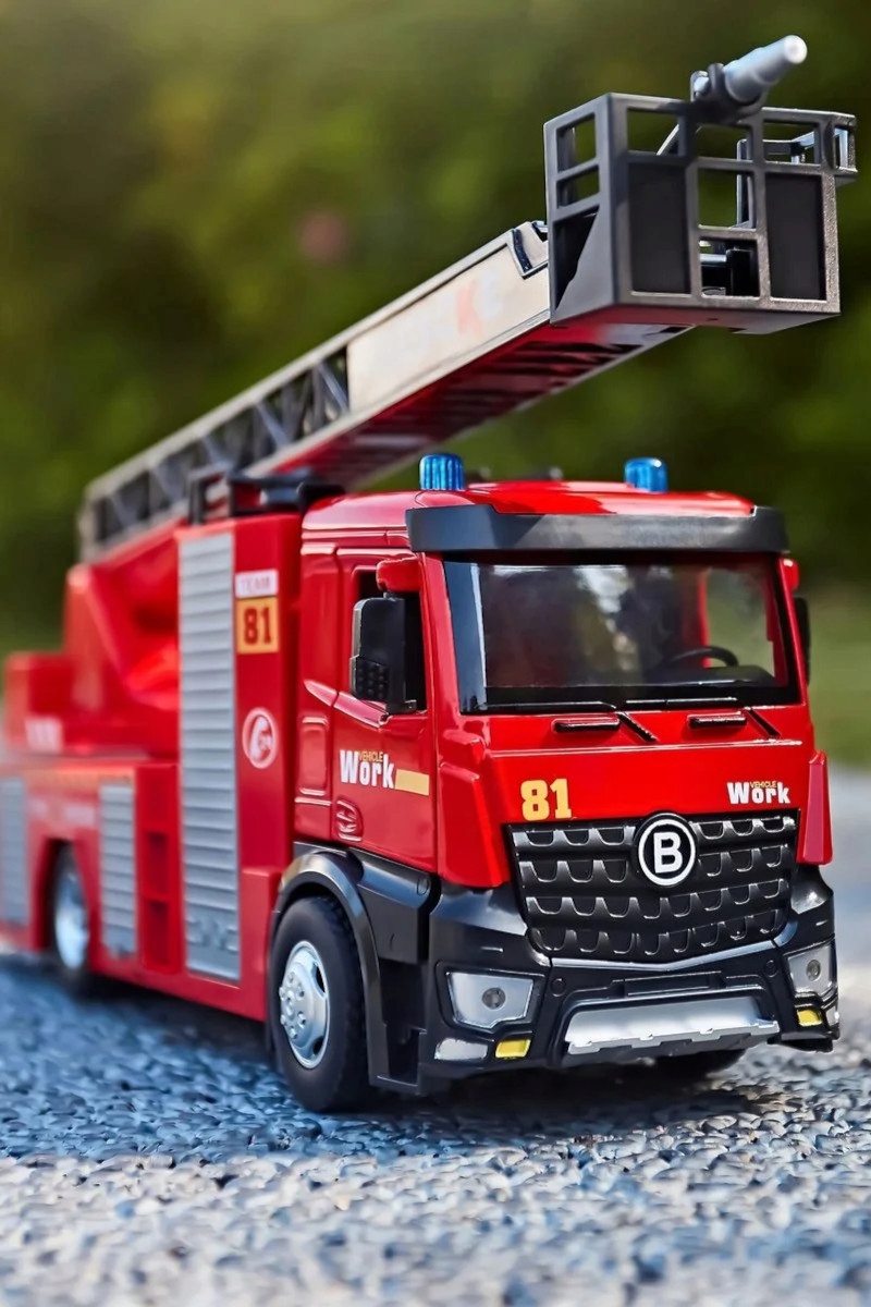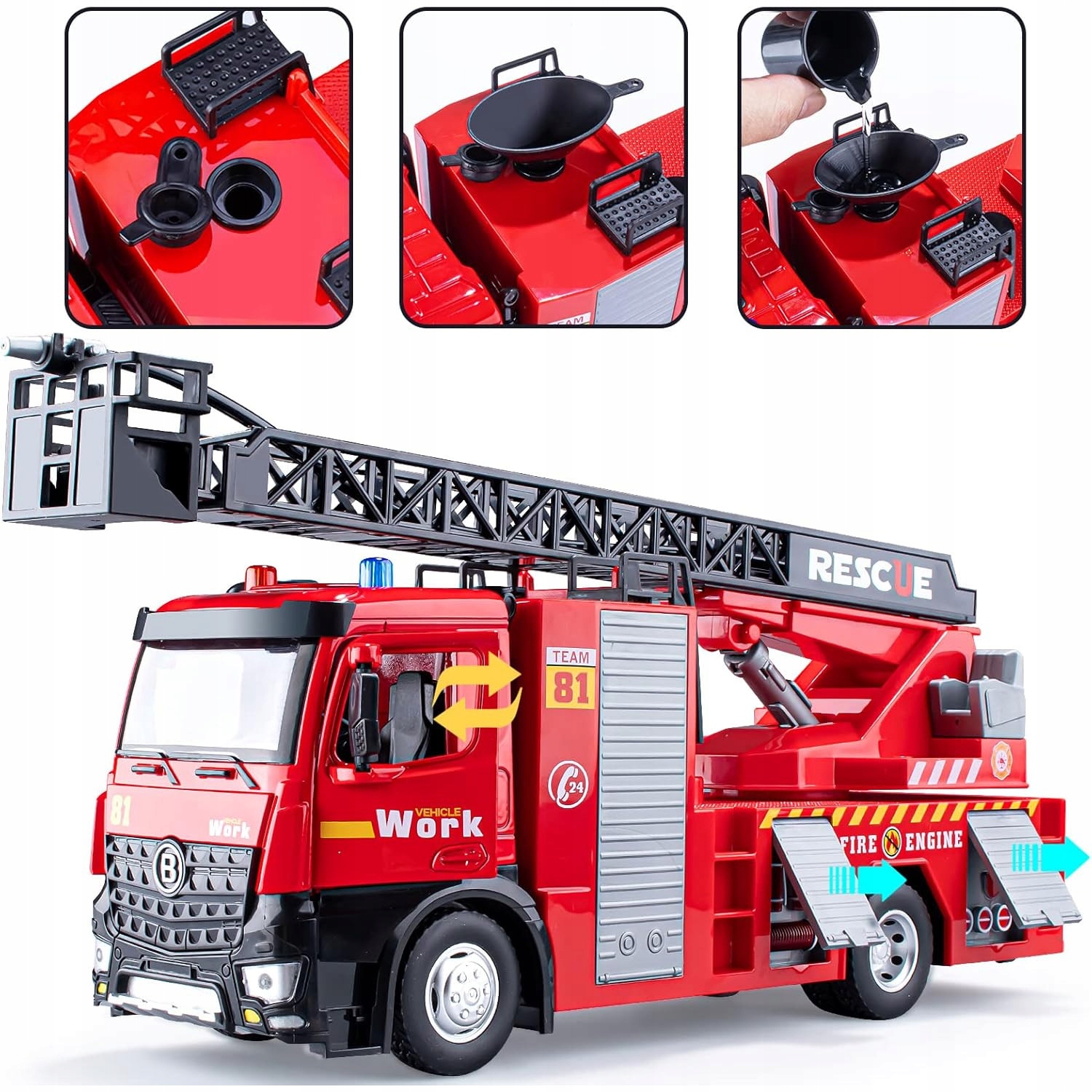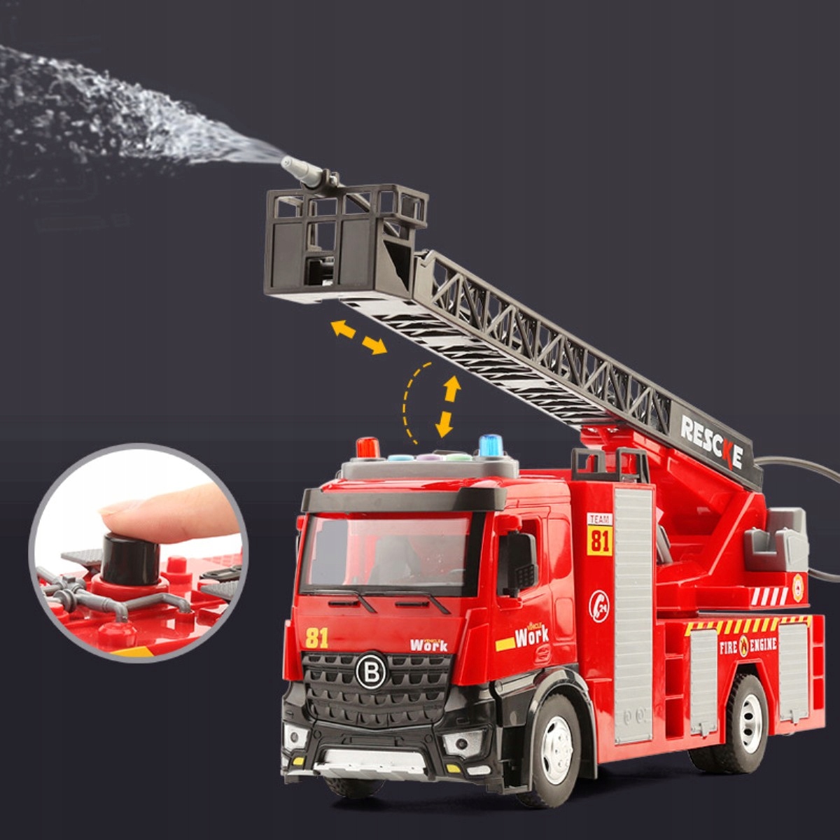 Реалистичная игрушка с вниманием ко всем деталям, напоминающая настоящую пожарную машину, привлечет внимание детей и взрослых. Возможность игры с водой делает ее намного интереснее и увлекательнее для ребенка. Собранный шланг на выдвижной лестнице разбрызгивает воду при нажатии черной кнопки.