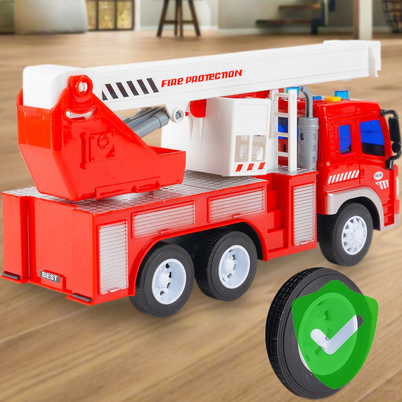 Красная пожарная машина со складной, вращающейся экстрактом корзины и движущимися колесами с приводом - просто положите машину на пол, нажмите вперед и отпустите машину, которая пойдет вперед!