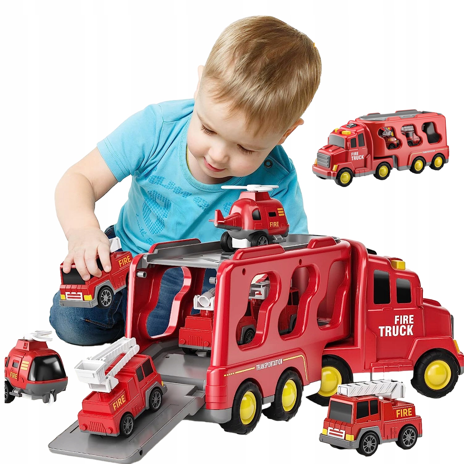🔥 - Предназначен для маленьких любителей пожаротушения, включает в себя большую транспортную машину и 6 небольших автомобилей (пожарная машина, автолестница, вертолет, грузовик). разбрызгиватель, автомобиль и внедорожник).