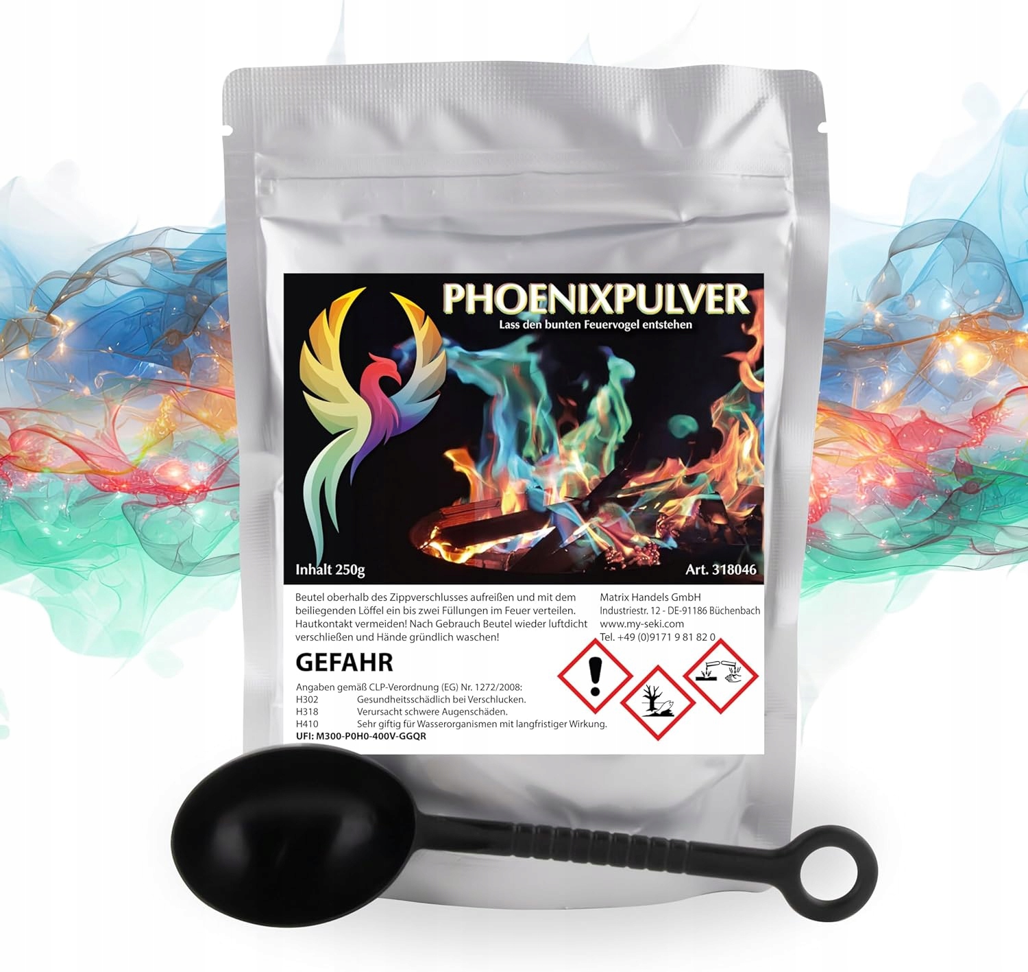 feuerfarben Порошок, изменяющий цвет огня, 250 граммов h1> - Принесите цвет в огонь! Просто положите 2 - 3 столовые ложки в очаге, и пламя будет окрашено на синий, зеленый, желтый, фиолетовый и красный. Простая дозировка с немедленным результатом. Идеально подходит для вашей следующей вечеринки в саду