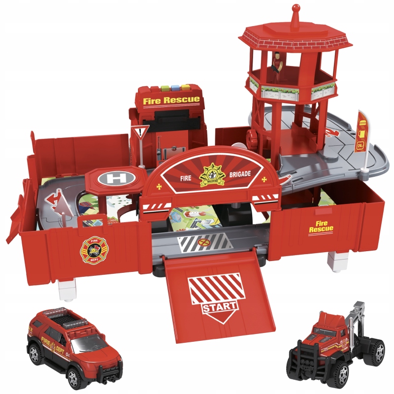 Пожарный гараж пожарной охраны с аксессуарами (установлен) Размер гаража после развертывания: 46,5 × 49 × 29 см, кнопки для звука и световых эффектов, вождение на холостом ходу, функция «Попробуйте меня» Активация функции Попробуйте меня: Удалите предохранитель из контейнера аккумулятора, который вы найдете в кабине автомобиля и попробуйте функции, нажатие на кнопку, крышу кабины. Содержание набора: пожарная машина/гараж 2IN1 (функция превращения из автомобиля в гараж и обратно), модель металлического автомобиля 1:64 (6 шт.) И вертолет.