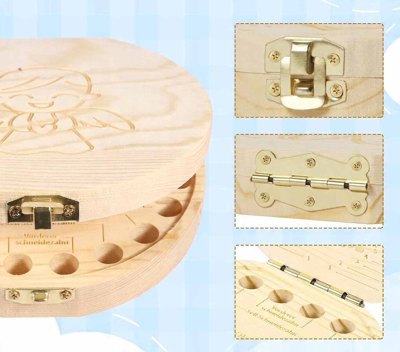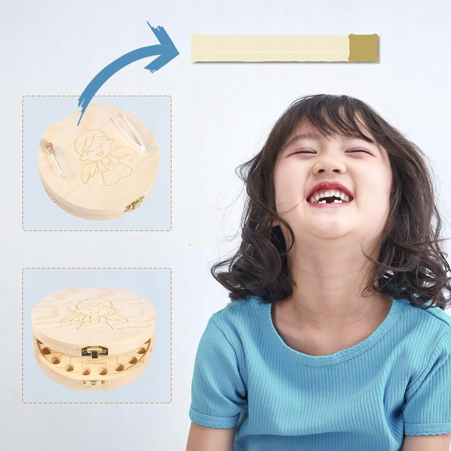 Коробка для зубов изготовлена из необработанной древесины, прочная и долговечная, ее нелегко сломать, гладкая поверхность без заусенцев, которая защищает кожу от повреждений и безопасна в использовании. Деревянная шкатулка для зубов выполнена в оригинальном цвете дерева, вы также можете создать свой любимый цвет. Зубная коробочка состоит из двух деревянных частей, соединенных между собой шарнирным переключателем, поверхность представляет собой рисунок ангела с улыбкой на лице, со встроенной прозрачной перегородкой. Зубчатый набор полностью укомплектован и включает в себя пинцет, стаканчик по желанию и ватную палочку.